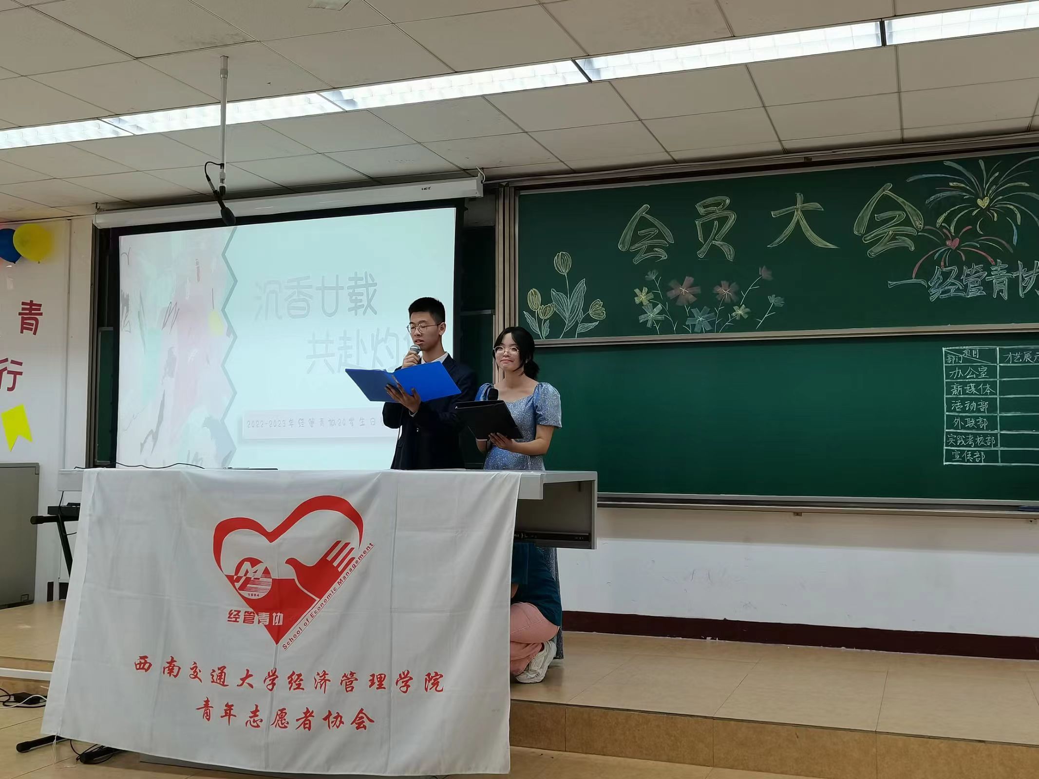 庄重的宣誓仪式过后,青协六大部门依次进行才艺展示,其中有搞怪活跃的办公室歌舞串烧《办公室爱你》、令人捧腹大笑的活动部小品《我的同学是我爸》、惟妙惟肖的实践考核部穿越剧《核酸风波》等精彩的节目。来自各个地域的文化相互碰撞,欢乐的气氛在人群中蔓延,各个部门的特色也展现得淋漓尽致,不知不觉间同学们就在这轻松活跃的气氛中逐渐熟络了起来。在才艺展示之间,外联部副部杭麟奇对于我们进行志愿服务活动的主要平台—志愿四川进行了介绍与操作教学,同时也为干事们介绍了经管青协四大活动基地。同学们兴致高昂,踊跃扫码加入;还有来自实践考核部的部长刘承对经管青协实践工作进行简要介绍,并着重介绍了暑期三下乡活动及交通公益活动。