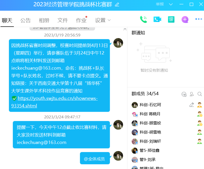 自2023年2月,各学院、各级团组织以多种形式进行广泛的宣传动员。在校团委和学院的通力配合下,经管学院师生充分了解了竞赛内容及总体安排。同时,学院团委通过建立挑战杯比赛QQ群的方式积极组织学院队伍参加比赛。各参赛队在老师指导下完成了申报作品,并完成了作品的提交。best365官网于四月初顺利收集各报名参赛队伍的材料。后续将结合实际情况统筹开展遴选,推荐优秀项目参加校赛,希望各报名队伍认真准备比赛,同时预祝选手们在比赛中取得理想的成绩!