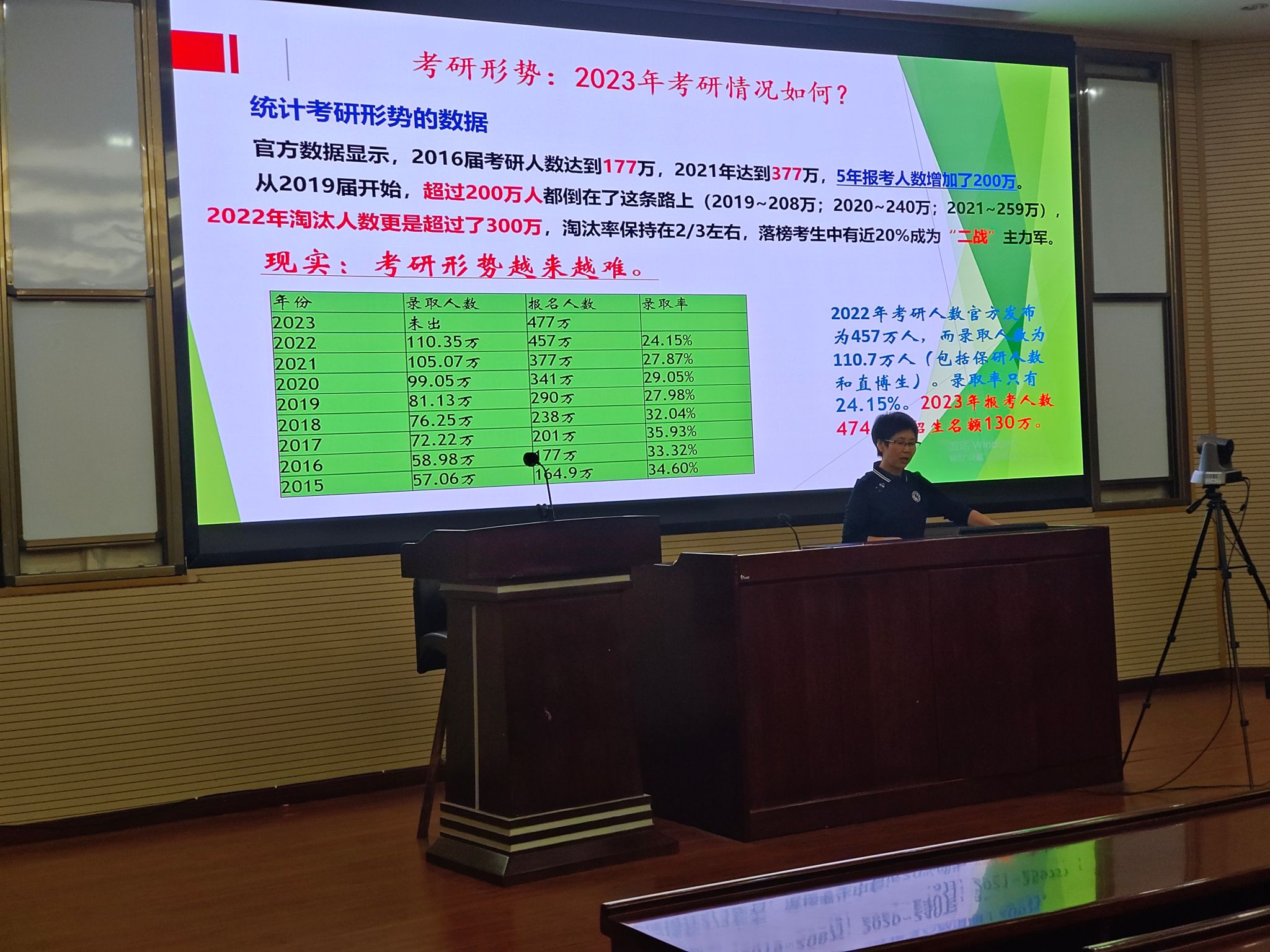 王老师首先从新冠疫情对就业的影响、就业竞争大就业压力大、毕业生心态变化、用人单位对毕业生的需求变化几个方面给同学们介绍了当前的就业形势与未来趋势。王老师给同学们分析了社会单位特别是企业开展校园招聘的节奏及秋招和春招的不同;介绍了目前的考研形势及学院学生考研的一些基本情况。在毕业去向方面,王老师介绍了大学生毕业时可能有的去向选择,重点介绍了升学这一选项,国(境)内升学及选择和出国(境)升学两种选择及不同。