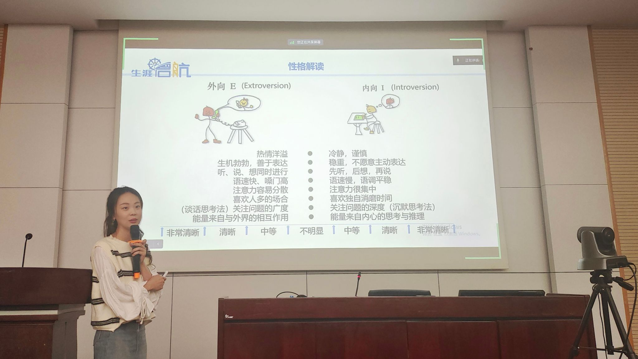 首先,张先凌为同学们带来“生涯启航”计划第四期——职业性格探索解读。张老师为同学们介绍如何利用北森生涯测评系统进行职业性格测评,鼓励同学们积极进行职业性格探索。张先凌老师还具体讲解了MBTI性格理论,详细分析了MBTI性格理论的四个维度、性格类型、职业匹配参考等等,引导和帮助学生尽早树立职业规划意识,提升综合素养和求职能力,树立正确的价值观和就业观,提前做好学业规划和职业生涯规划。