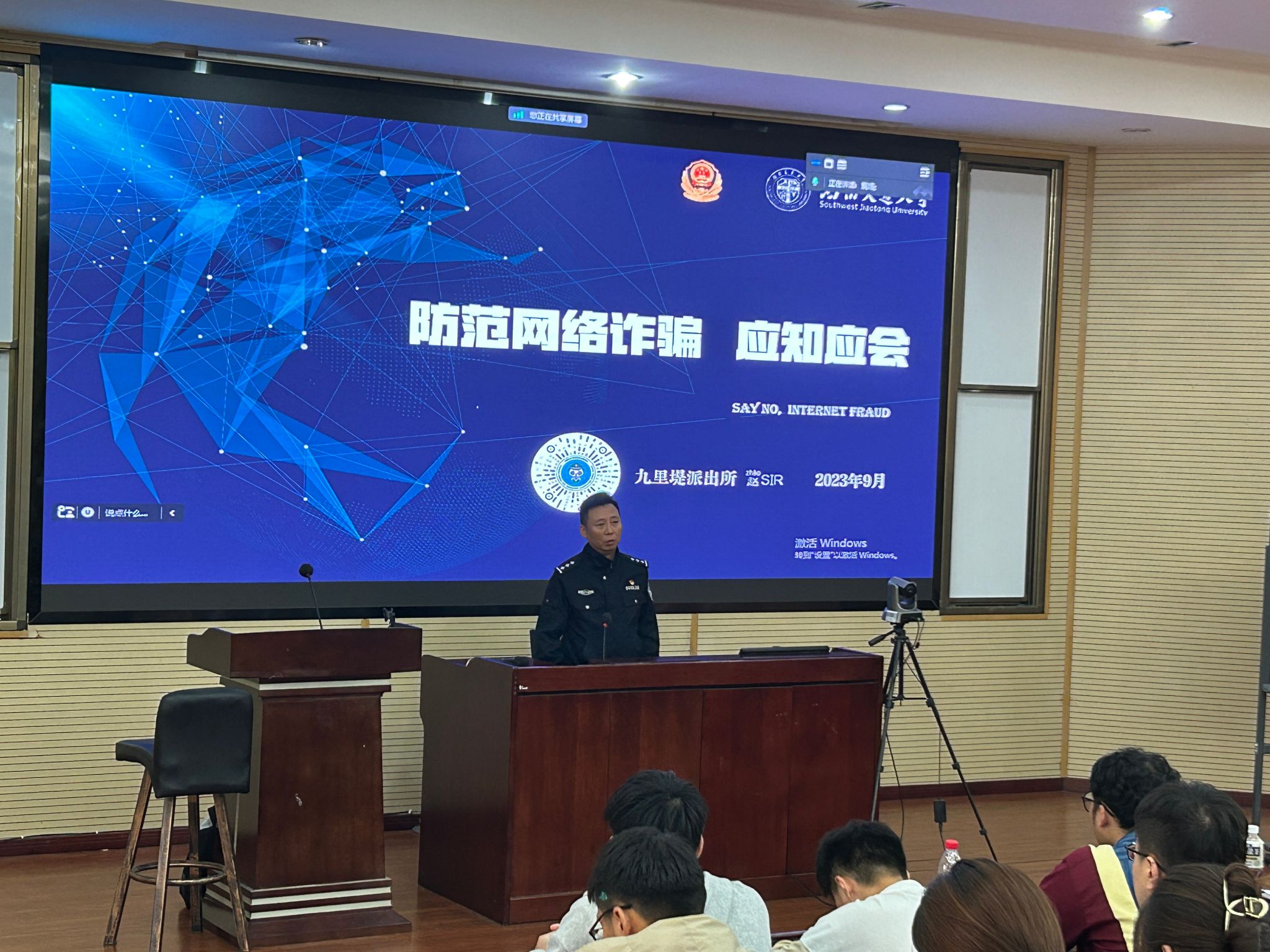 2023年10月12日,下午4点,在0202教室,best365网页版登录官方网站邀请九里堤派出所民警为全体研究生新生开展了一场反诈讲座。讲座邀请到了九里堤派出所具有多年防诈经验的民警赵磊主讲,研究生辅导员贺小轩、李勇也出席了讲座。