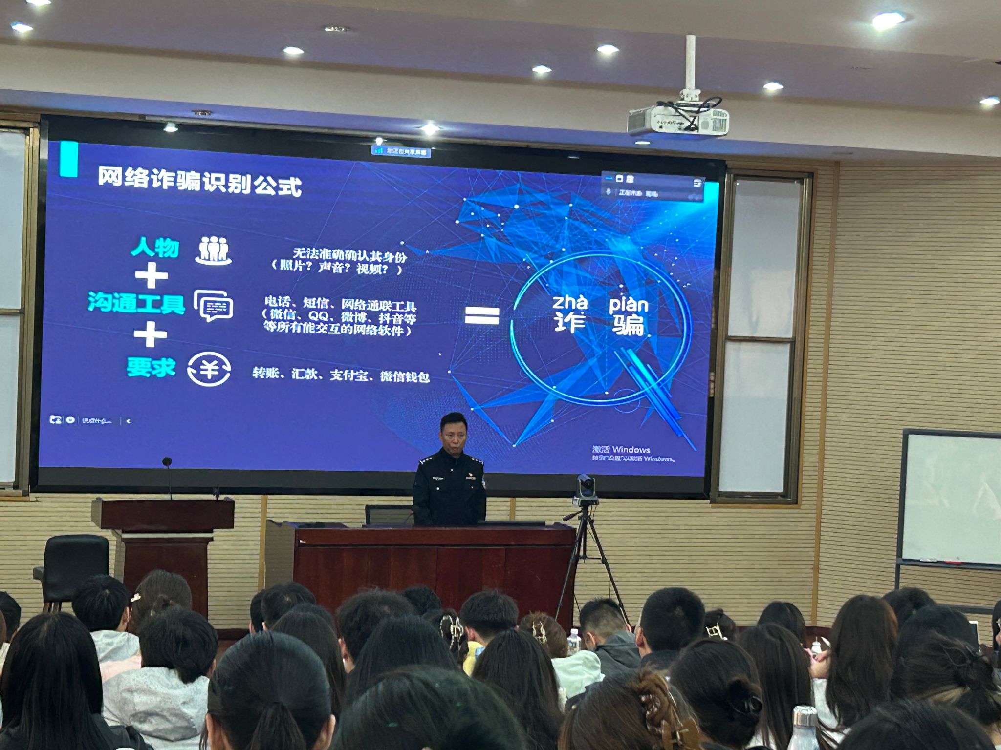 在搞清楚“什么是”和“为什么防”后,赵警官凭借多年防诈骗工作经验为大家列举了十种常见的诈骗套路,包括刷单返利诈骗、杀猪盘诈骗、冒充熟人或领导诈骗等。并反复提醒学生要特别警惕转账汇款或者输入敏感信息的事情。