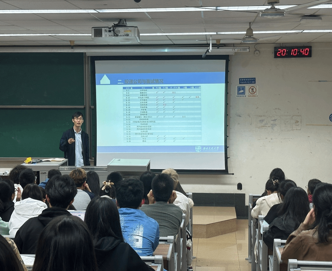 接下来,辅导员苏扬老师也为简历制作做了进一步的补充,并趁热打铁为同学们讲解了有关面试的内容,不仅将投递公司与面试情况的时间线以表格的形式列出,而且也将对求职过程的分析以数据的形式展现出来,使同学们更深一步地了解面试求职的过程。最后,苏老师通过讲述求职经验与求职心得,将求职时需要考虑的因素和维度逐一展列,帮助同学们明晰内心的选择。