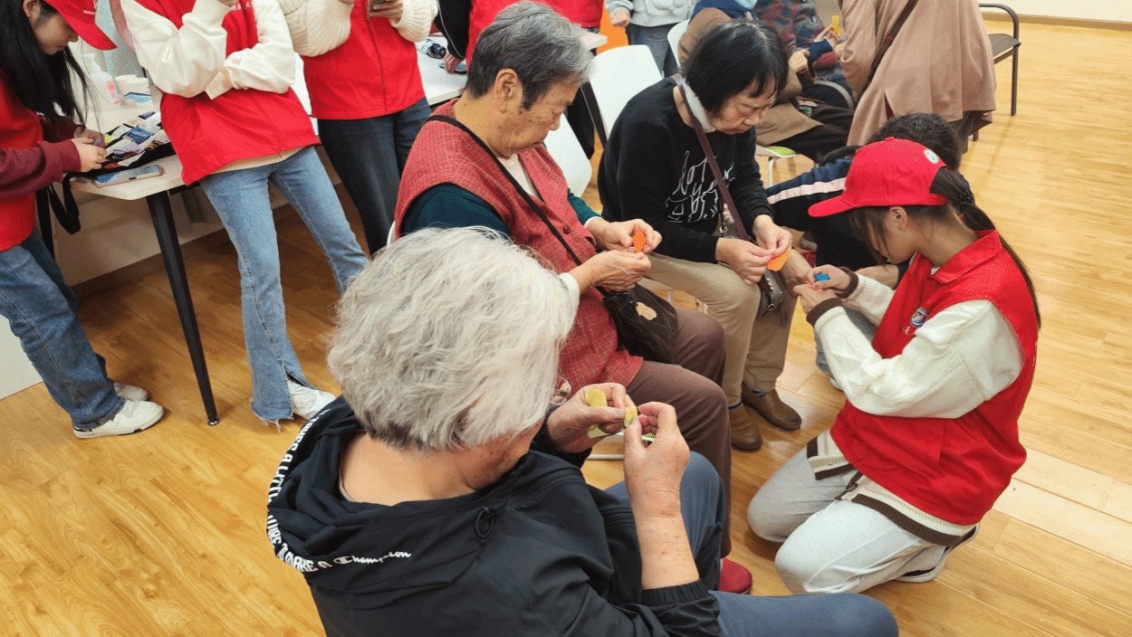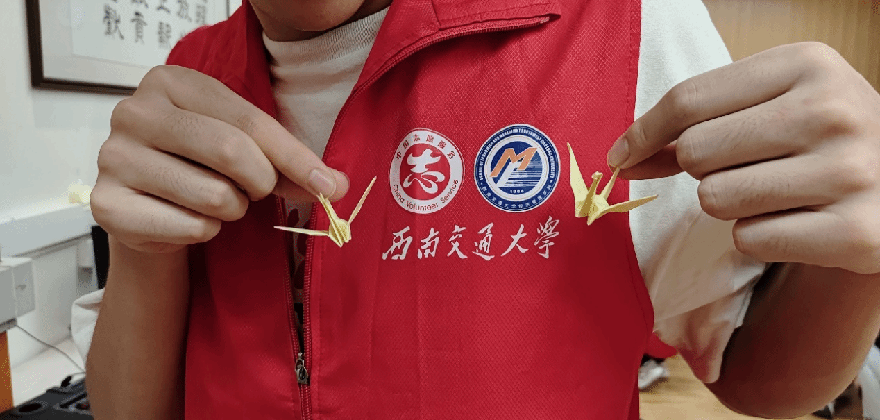 游戏环节结束,志愿者开始带领老人们学习手指操。手指操包括手心相对、上下摩擦,两手拇指、食指做爬梯等动作,老人们学习得很认真,还与大家分享活动关节的方法。最后,志愿者教老人们折纸花,不一会,一个个爱心、一只只千纸鹤跃然指尖。两个活动既锻炼了老人们手指运动的能力,也拉近了青年志愿者与老人们的距离。