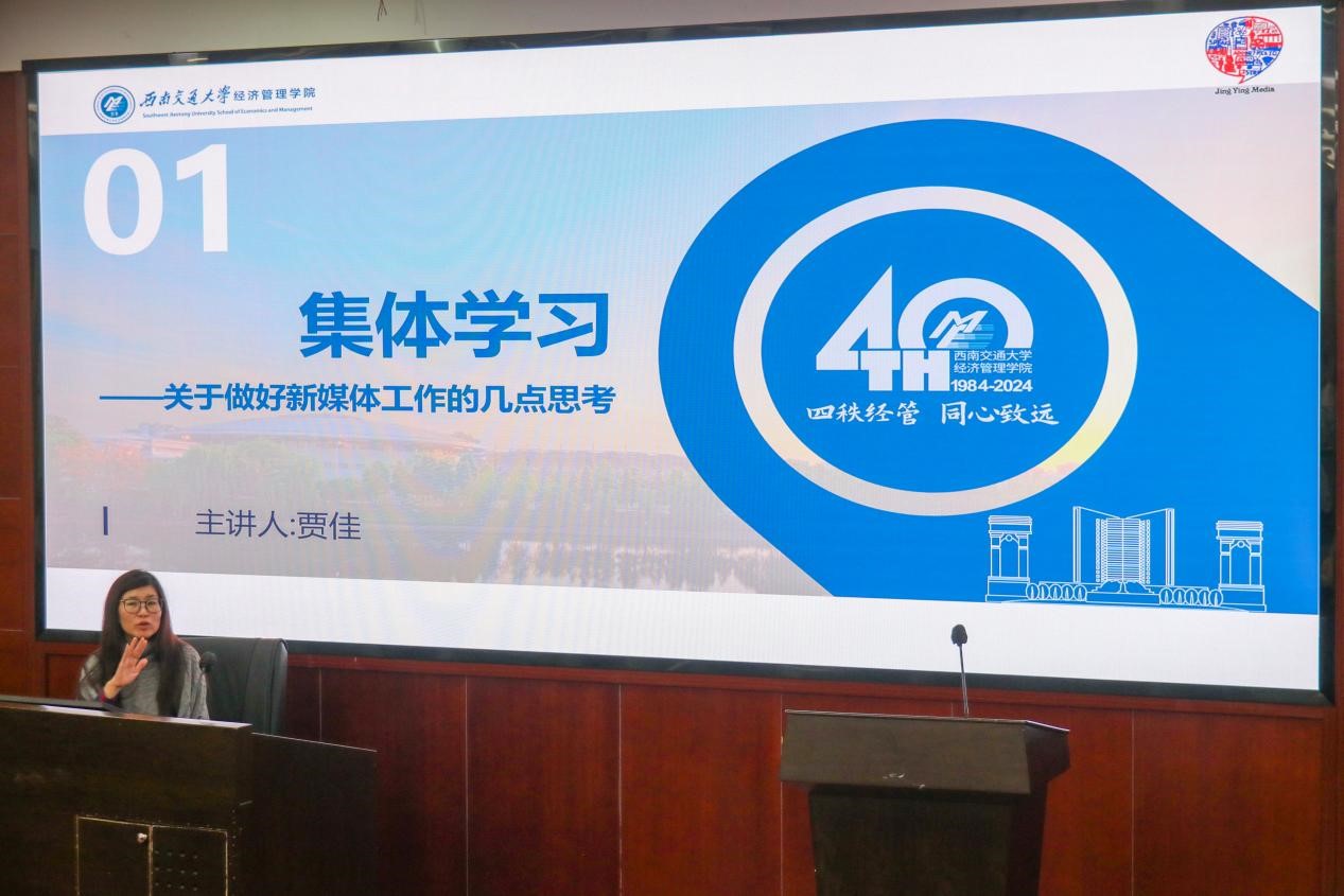 在团学组织新闻会议培训会中,经英传媒中心传媒事务部冯婉晴以“公众号‘交大经管新青年’推文发布相关事宜”为主题,从推文写作要求讲解、推文发布安排、推文规范三个方面进行了详细全面的经验总结。对公众号、内容排版、头条安排等做了明确的要求,同时也对出现过的问题做出了总结及应对方案。