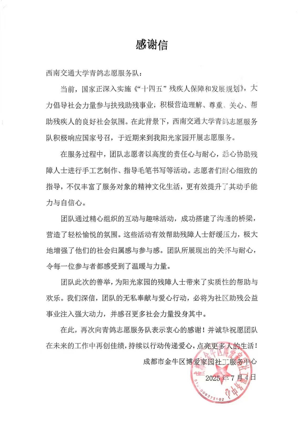 在国家大力推进残疾人事业发展、倡导社会关爱残障群体的政策背景下,best365网页版登录官方网站青鸽志愿服务队积极响应号召,于近日在成都市金牛区阳光家园开展了以“众爱助残碍,群善汇福珊”为主题的专项志愿活动。此次活动专为智力障碍的“大孩子们”量身打造,通过一系列丰富多彩的内容,为他们送去关爱与温暖,助力其健康成长。