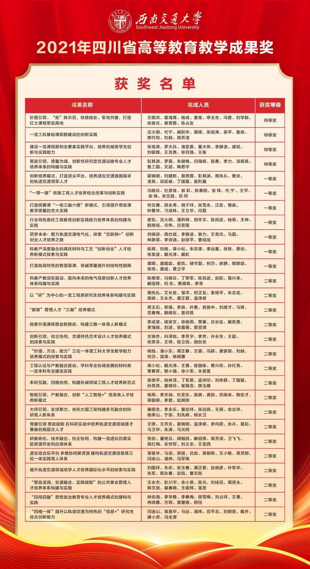近日,四川省人民政府公布了2021年四川省教学成果奖名单。best365网页版登录官方网站主持获批四川省高等教育教学成果奖特等奖4项、一等奖7项、二等奖17项,获特等奖数量全省第二。另外参与获批特等奖1项、二等奖3项。在本届四川省高等教育教学成果奖获奖率减少30%的前提下,学校主持获奖总数较上届增加2项,获奖数量占全省比例提高17%。