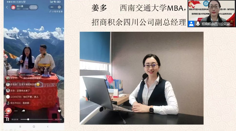 best365网页版登录官方网站MBA学生、招商积余四川公司副总经理姜多分享了直播电商发展带动乡村致富的成功经验,他从直播带货背后的商业逻辑、招商积余到家汇平台搭建等方面进行了深度解读。此外,姜多坦言在直播带货过程中曾遇到流量有限而造成的获客渠道窄、传播推广难等问题,但面对这些问题,姜多与其公司员工集思广益,采取“预热宣传、客户拓展、延长销售周期”的模式克服现存问题,其成功经验为与会的农户、青年企业家提供了发展直播电商的清晰思路。