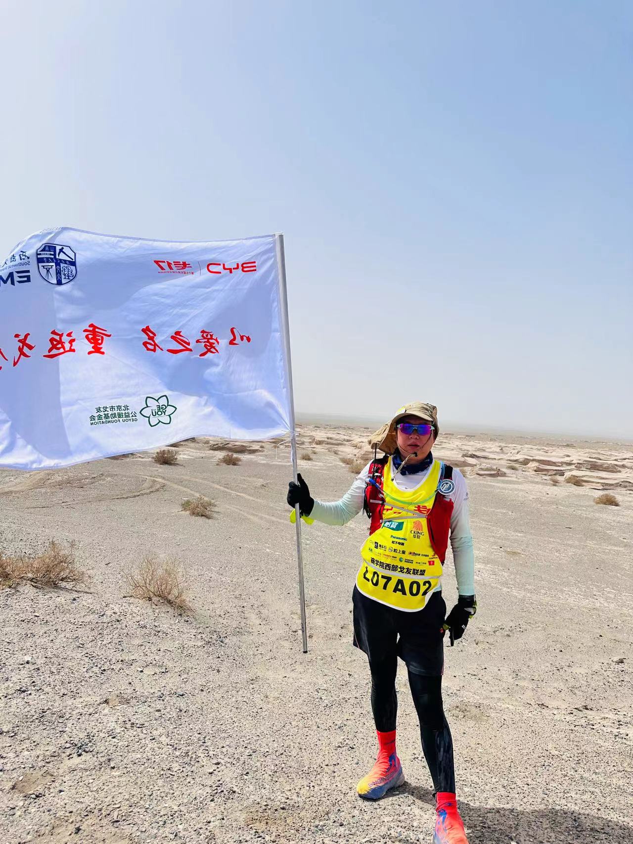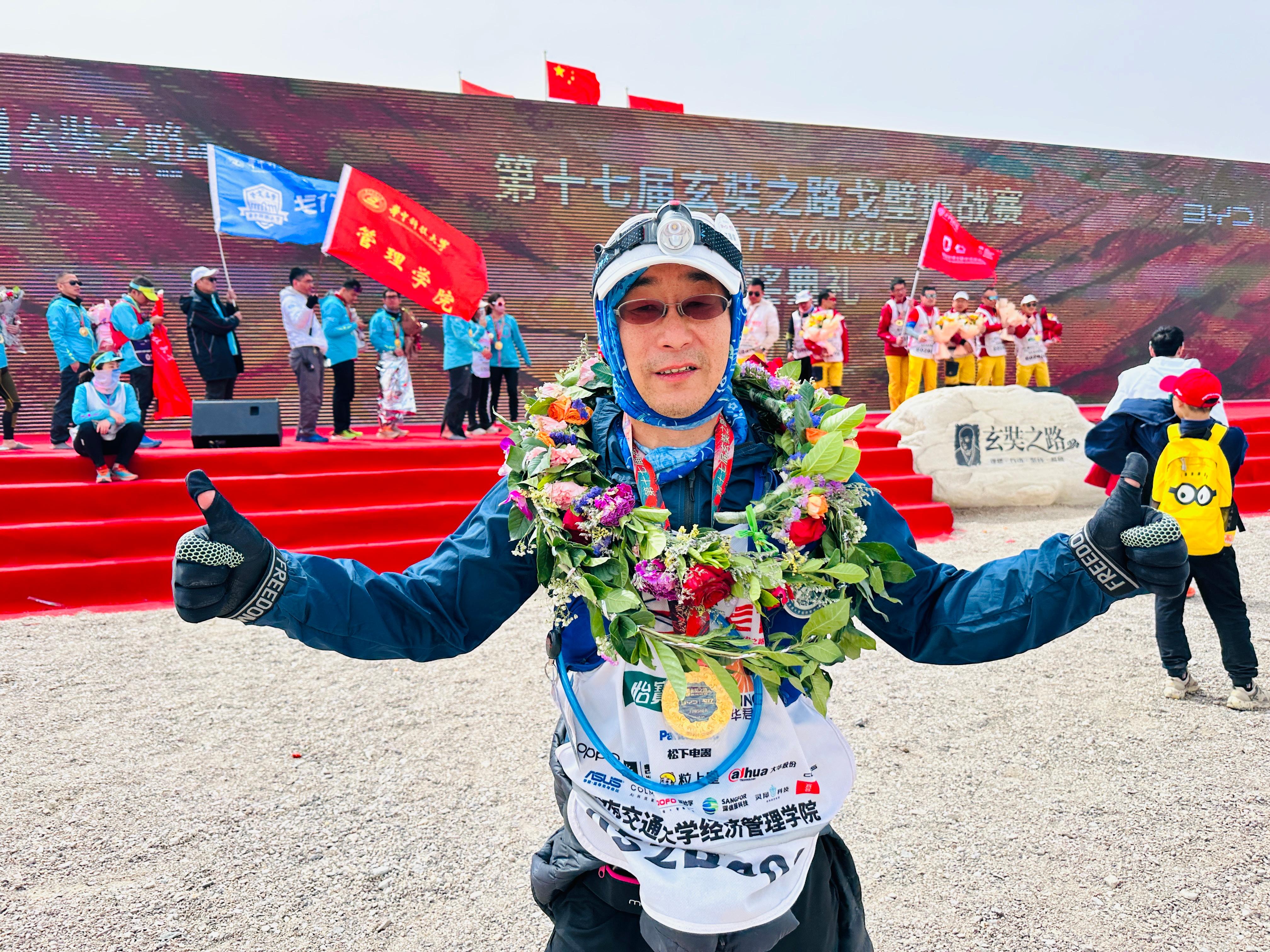 戈赛A+组是玄奘之路戈壁挑战赛最难的组别,选手需在22小时内跑完其他选手在四天三夜内完成的121公里路程,全程需要自补给、自导航,日夜兼程。今年的戈赛,天气异常突变和恶劣,昼夜温差大,风沙肆虐到一度熔断A+的赛程,完赛率只有36%。拓守盛校友以超人的意志力只用了16小时完成比赛。他身披学院旗帜冲过终点时,全场响彻起最激动人心的欢呼声,“best365网页版登录官方网站”这几个字也第一次打在戈壁挑战赛舞台的冠军榜上!