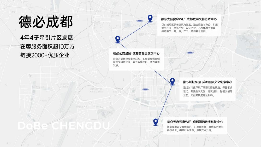 德必集团于2003年成立,从2006年开始投资运营文科创产业园区。目前已在上海、北京、杭州、成都等17所城市运营70余个文科创产业园,服务着20余万名企业员工,是中国首家创业板上市的产业园区运营服务商。自2018年进入成都后,德必成都积极通过“选商”+“育商”的模式,聚集了川内最具创意的科文创企业,同时也引入北京、上海、深圳等一线城市众多数字科创、文化艺术与总部企业。