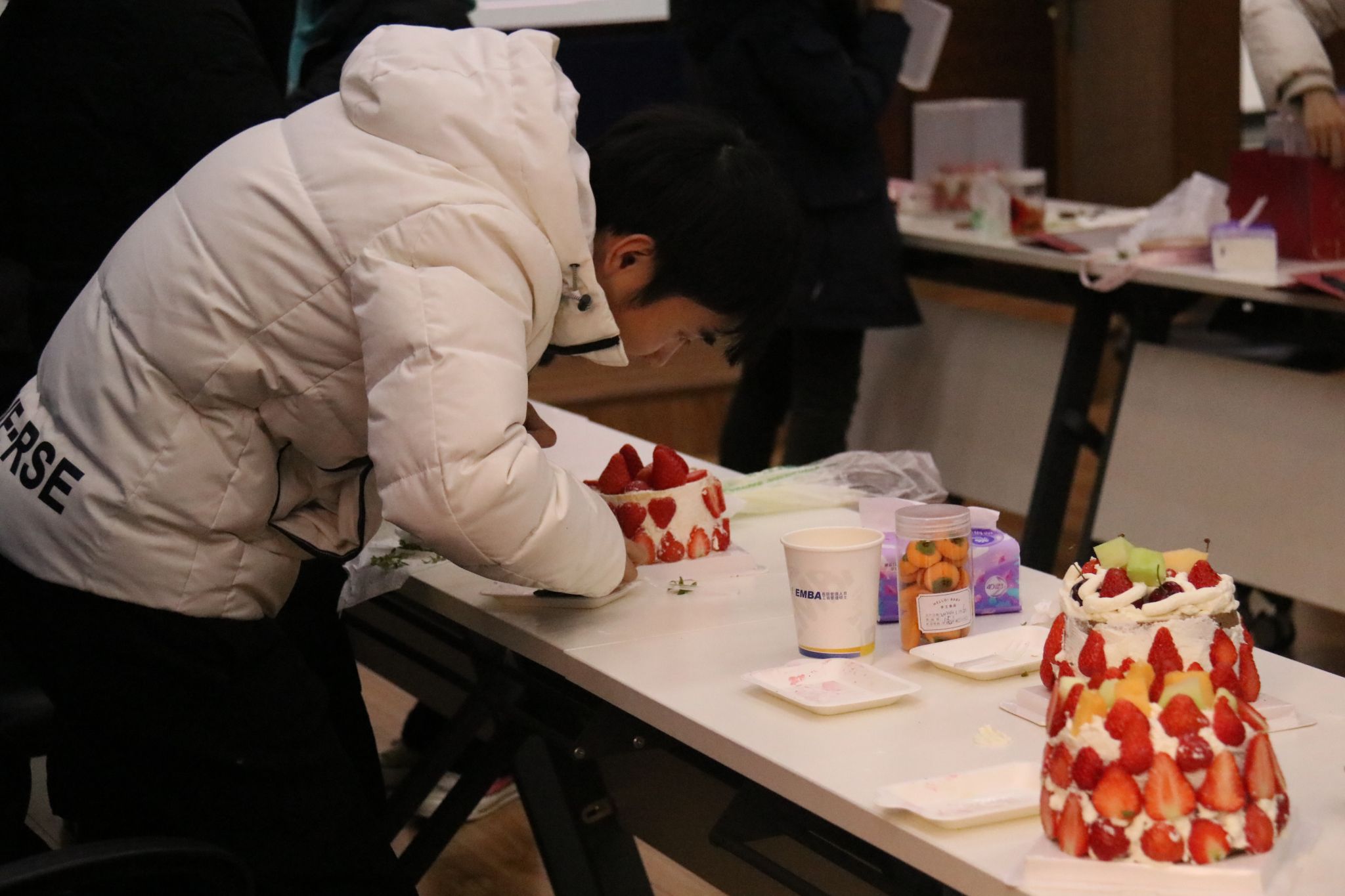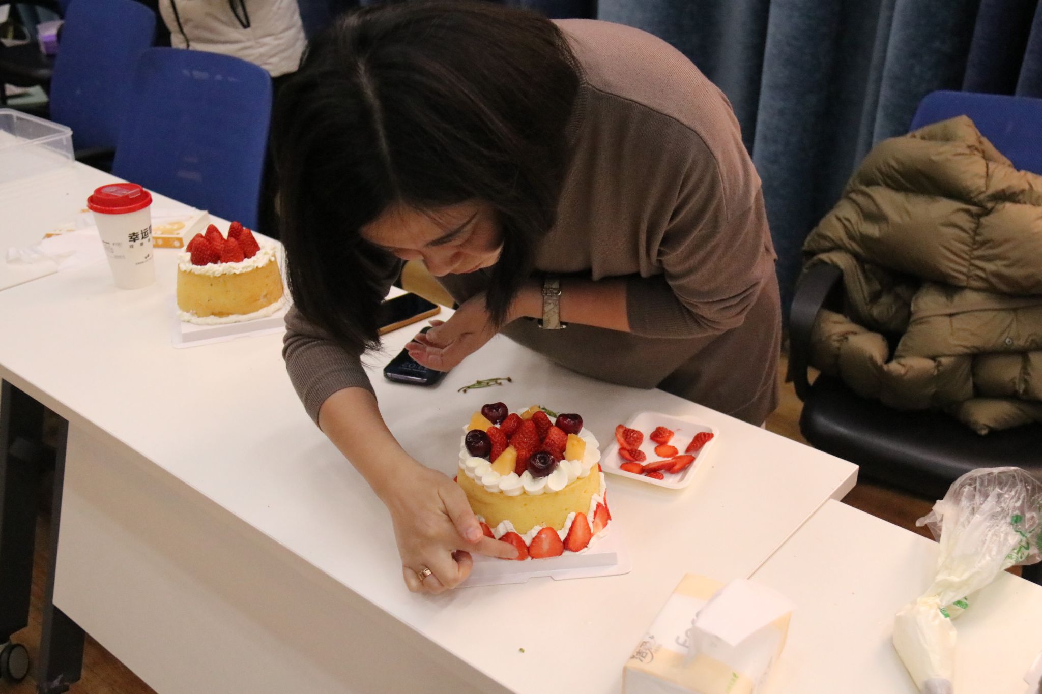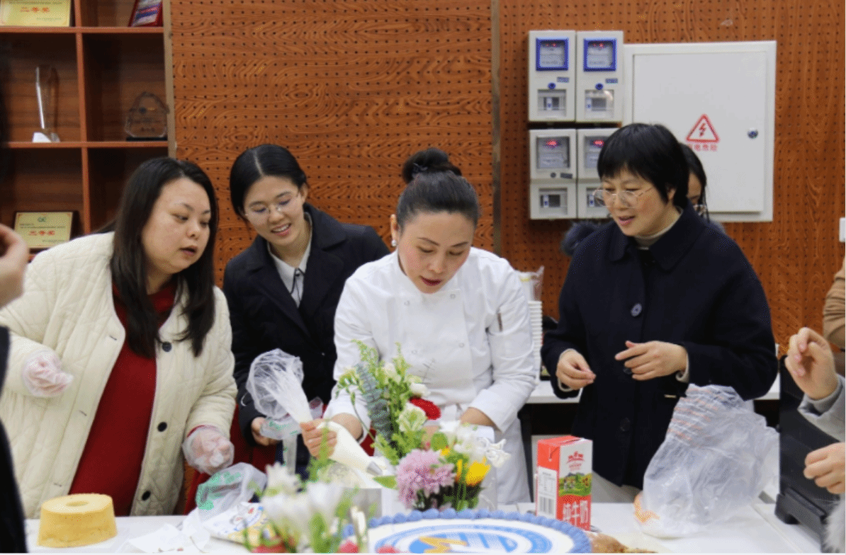 在烘焙师的指导下,老师们学习认识每一种烘焙原料,了解制作步骤,掌控好原料比例与烤箱温度,亲手制作精美糕点。一枚枚“柿柿如意”曲奇、一份份精致的水果蛋糕,一杯杯沁人心脾的茶饮,让在场的每一位教职工都感受到了满满的幸福感。随着香味飘散弥漫,活动现场充满了欢声笑语,留下了珍贵、美好的回忆。