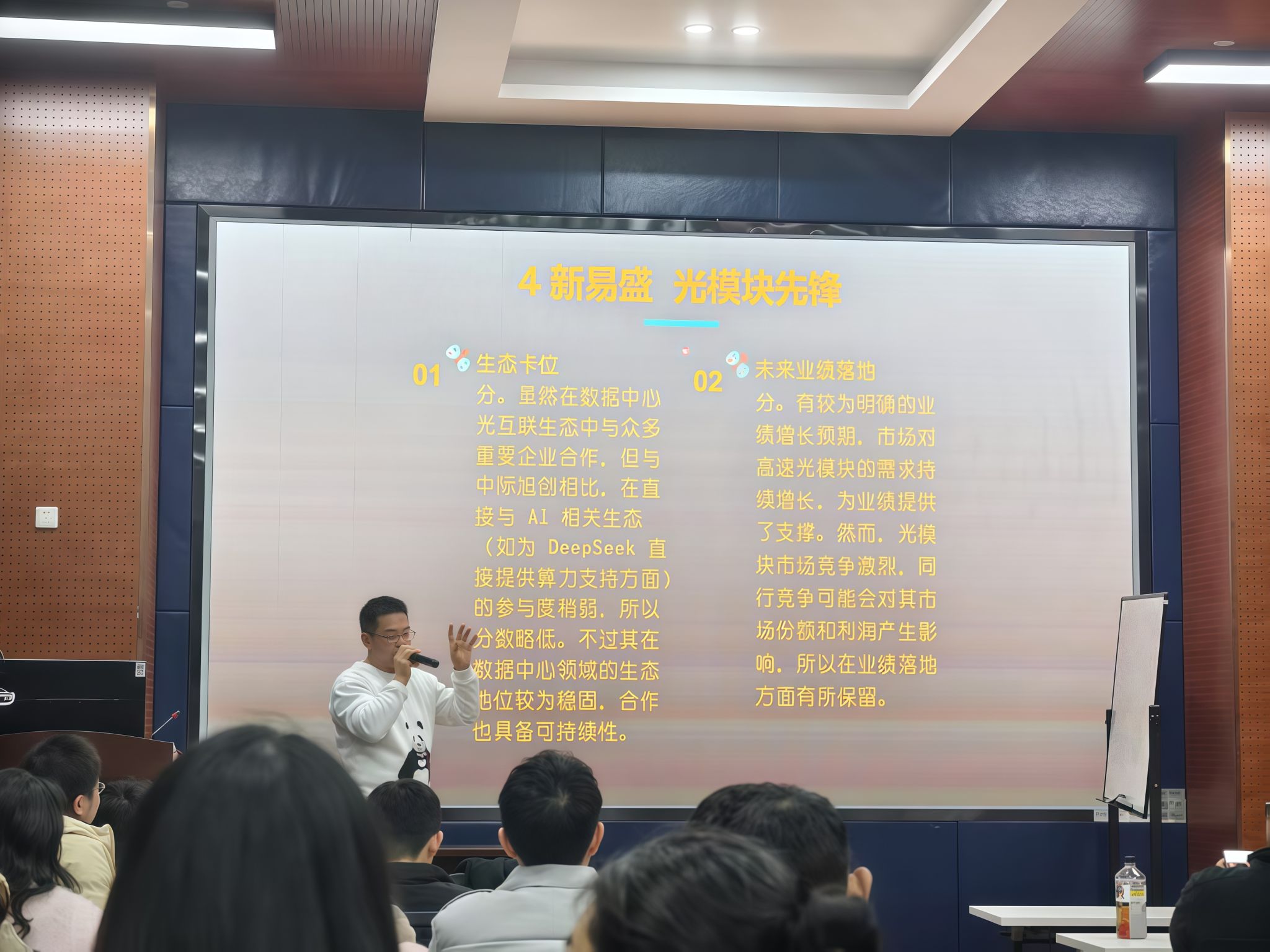 2025年3月15日晚7点,火眼财睛董事长汤中建应邀在best365网页版登录官方网站开展了题为“在十倍AI赛道选十倍股”的讲座。本次讲座以DeepSeek为代表的人工智能产业崛起为切入点,旨在通过剖析AI前沿技术应用以及相关产业链,为学生投资实践与未来职业发展提供帮助。本次讲座由学院专业学位教育中心副主任诸波主持。