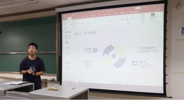 炼一等品行,经世致用。苏老师为我们展示了往届毕业生升学和签约单位情况,希望能给大家带来一定参考,激励大家飞得更高、走得更远。在大二学年,19级的同学们不仅在学业上有所收获,更亲身投入社会实践,用双手创造,用心感受。本次大会由19级的六位同学进行了暑期实习实践分享,他们有的进入一流地产公司,对行业现状有了一定的了解,明确了自己未来的道路;有的走进金融投行领域,在一个月的学习体会下,自己完成了公司交予的任务,成长颇多;有的走上街头,随访市民,近距离探究成渝双城经济圈未来发展;有的走向乡村,深刻领悟扶贫工作的意义。其中,黄纪凯、凌川奇两位同学给大家分享了自己的实习经验,谈到一些面试相关的小技巧时同学们也认真地做着记录。