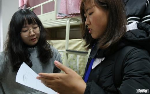 在走访女生寝室时,同学们对学校的意见就比男生们多很多。当被问到权益的维护时,同学们侃侃而谈,“希望学校可以从细节着手,努力维护学生正当的权利”;当问到社会融入感时,同学们希望学校可以多组织一些社团活动,丰富大家的课余生活。同时她们希望,学校食堂的菜可以多换一些口味……在采访的过程中,学生会的同学认真记录,努力使大家的意见都得到充分的表达。
