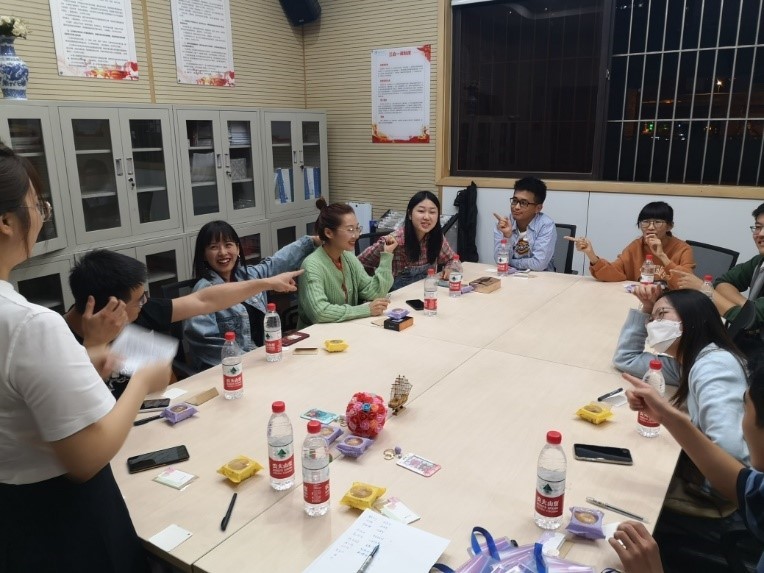 在活动现场,师生们积极参与猜灯谜游戏,体验中秋节的传统趣味游戏,一些巧妙的题目设置,不仅增添了节日氛围,也让活动气氛活跃了起来。“谁是卧底”游戏中,游戏词汇为与中秋节相关的词语,同学与老师在描述词语的过程中,也各自抒发和加深了对相应节日元素的认识。“击鼓传花”游戏中,收到花球的同学在主持人的邀请下分享了与“月圆” “团圆”“国家”等主题相关的诗词和歌曲。大家在欢声笑语中过节,在轻松愉悦的氛围中体验民俗文化。