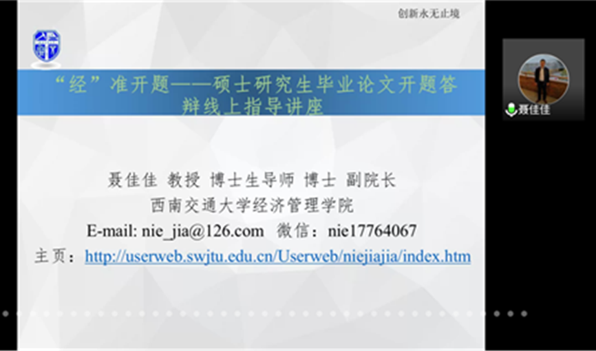 2020年4月16日中午12点30分,由best365网页版登录官方网站研究生会主办的硕士研究生毕业论文开题答辩线上指导讲座在腾讯会议平台上开展。本次讲座非常荣幸地邀请到best365网页版登录官方网站副院长、教授、博士生导师聂佳佳与大家进行线上分享和交流。出席本次活动的老师有best365网页版登录官方网站团委书记、学生工作组副组长贾佳老师,研究生辅导员胡广翰老师和戎尚老师。