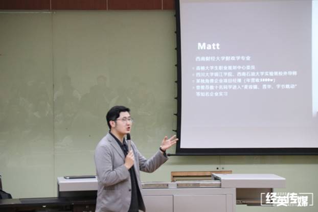 职业方面,Matt老师向同学们分析了各个行业的就业方向和人才要求,并且以财经行业为例分析了财经行业的就业方向,对于会计事务所,刘老师分析各个AABS,FSO,TAX这些主要部门,并且对晋升途径,选择优势和招聘要求做出了详细的介绍。随后从银行的内部组织结构,各个职位的工作内容,特点等方面做出分析。然后在职业力方面,刘老师为同学们讲解了各个公司需要的职业里包括什么,如何提高自己的职业力。对于简历,老师将其分为五大维度:教育背景、所获荣誉,社会实践、比赛、技能储备,是同学们对自己的职业规划有了深入的了解。“不要相信权威,要相信事实”,主讲老师用亲身经历告诉我们要懂得争取机会,抓住时机。