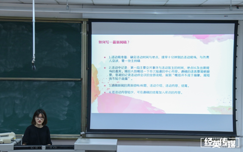 随后,由经英传媒中心采编部赵哲为同学们讲解如何写一篇规范的新闻稿。她的讲解主要分为三个部分:什么是新闻稿、如何写一篇新闻稿、如何使一篇稿件更规范。在介绍如何使一篇新闻稿更规范时,她分别从新闻写作内容、写作格式、写作注意事项为同学们带来讲解,并为同学们解释了如何在best365网页版登录官方网站院网挂稿。