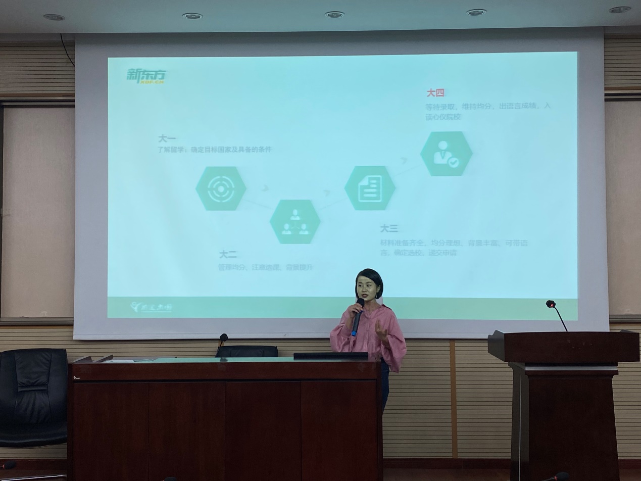 熊颖主要从全球各国留学政策以及留学申请时间规划两方面和同学们做了一些分享,她为同学们介绍了加拿大、英国、美国等不同国家留学的优点,为想要出国留学的同学们的时间安排以及材料准备上提出了一些建议。