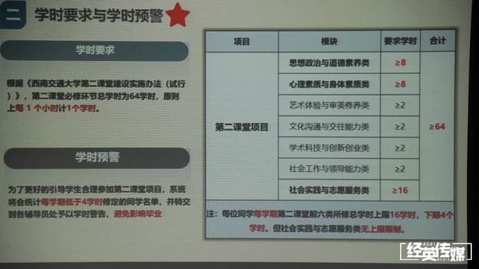 交大的第二课堂分有七个板块:思想素质与道德素养、心理素质和身体素质、艺术体验与审美修养、文化沟通与交往能力、社会工作与领导能力、学术科技与创新创业、社会实践与志愿服务类。宣讲人着重强调了第二课堂认定要求和学时预警,同时提醒同学们注意一些常见误区。新生们在宣讲人的带领下,登录选课系统,熟悉选课流程。