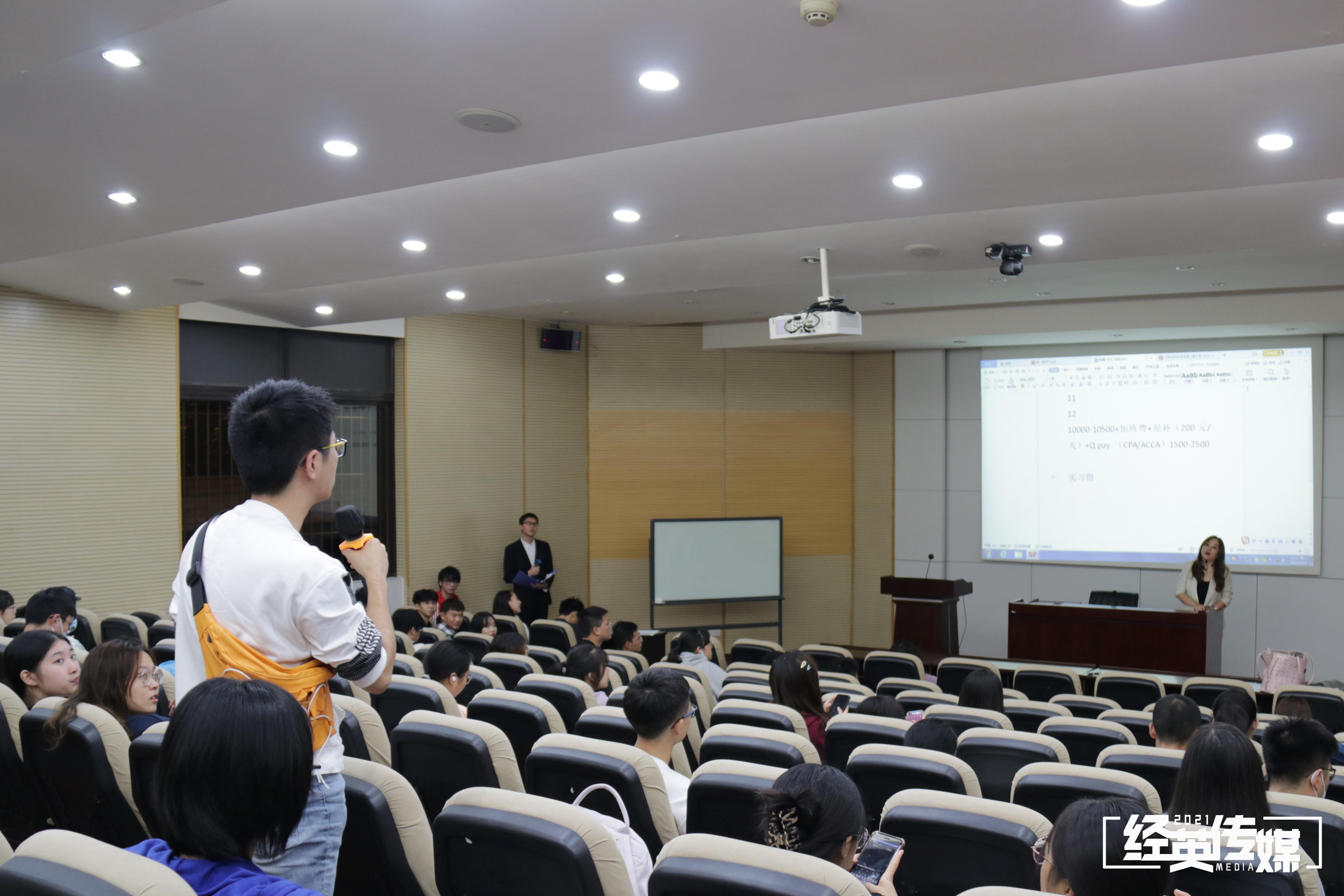 临近讲座尾声,任老师再次提到在生涯规划中自我认知的重要性,通过分享自身做规划时进行的自我认知让同学们对自我认知的概念更为清晰,并鼓励同学们积极培养全面领导力、商业敏锐度、全球化思维、关系拓展力以及专业化技能(包括商科专业知识、英语水平及计算机office应用水平等)。