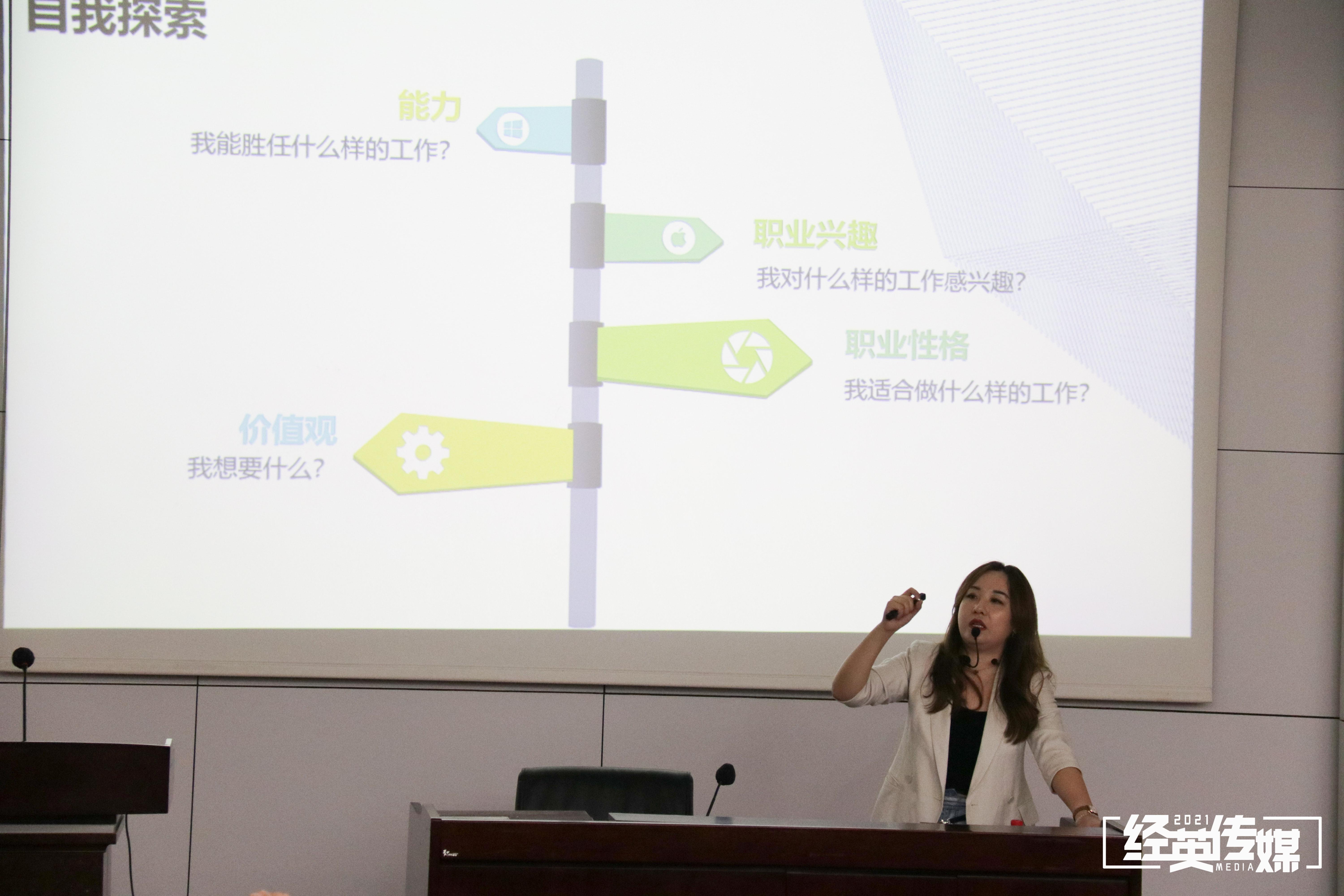 紧接着,任老师便着重强调了自我认知的重要性,“适合自己的才是王道”,这就需要同学们进行自我探索。第一是能力的自我认知,需要同学们思考自己的能力范围、适合的工作类型;第二是职业兴趣的自我认知,需要同学们思索自身的兴趣所在;第三是职业性格的自我认知,需要同学们认清自身性格,判断出适合自身性格特点发展的工作;第四是价值观的自我认知,需要同学们弄清自我内心,知道自己真正想要的是什么。任老师通过这四个方面的自我认知介绍,给同学们指明了有效自我分析的路径。