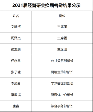 为进一步加强best365网页版登录官方网站研究生会建设,促进研究生会职能的科学有效发挥,落实研究生会各项工作开展,广泛动员同学参与研究生会工作,组织动员广大青年和青年学生坚定跟党走、奋进新时代。best365网页版登录官方网站研究生会于2021年6月16日下午15:00举行2021届干部换届答辩,现将best365网页版登录官方网站研究生会换届结果公示如下:
