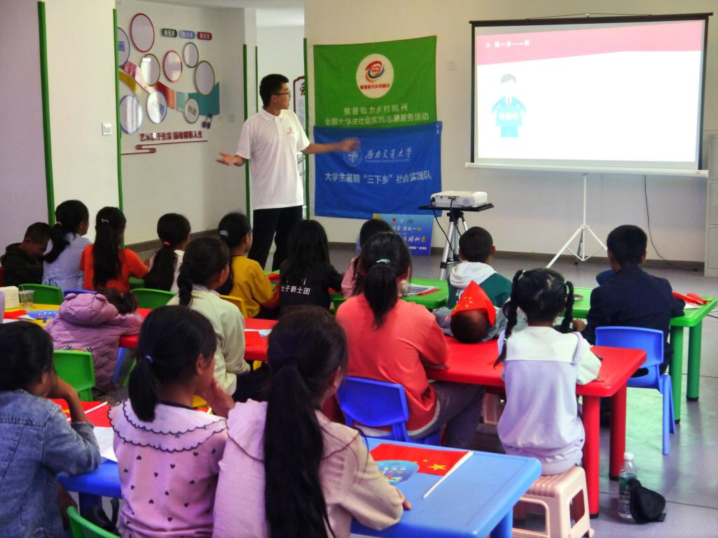 第四天,实践队在社区开展了推普文化小课堂。队员们用形象生动的表演向孩子们表述学好用好普通话的重要性;通过趣味识字、诗歌朗诵、绕口令、击鼓传花等趣味活动,寓教于乐,寓学于趣,带领学生巩固单、多音节发音,引导学生体验普通话的形美韵美音美。队员们与孩子们高效的课堂互动,创造了良好的语言交流环境,不少孩子纷纷上台用普通话讲述自己的家乡和梦想。随后,队员为孩子送上纸和笔,帮助孩子们用手中画笔描绘自己的家乡,引导孩子用普通话分享自己对家乡和祖国的热爱。