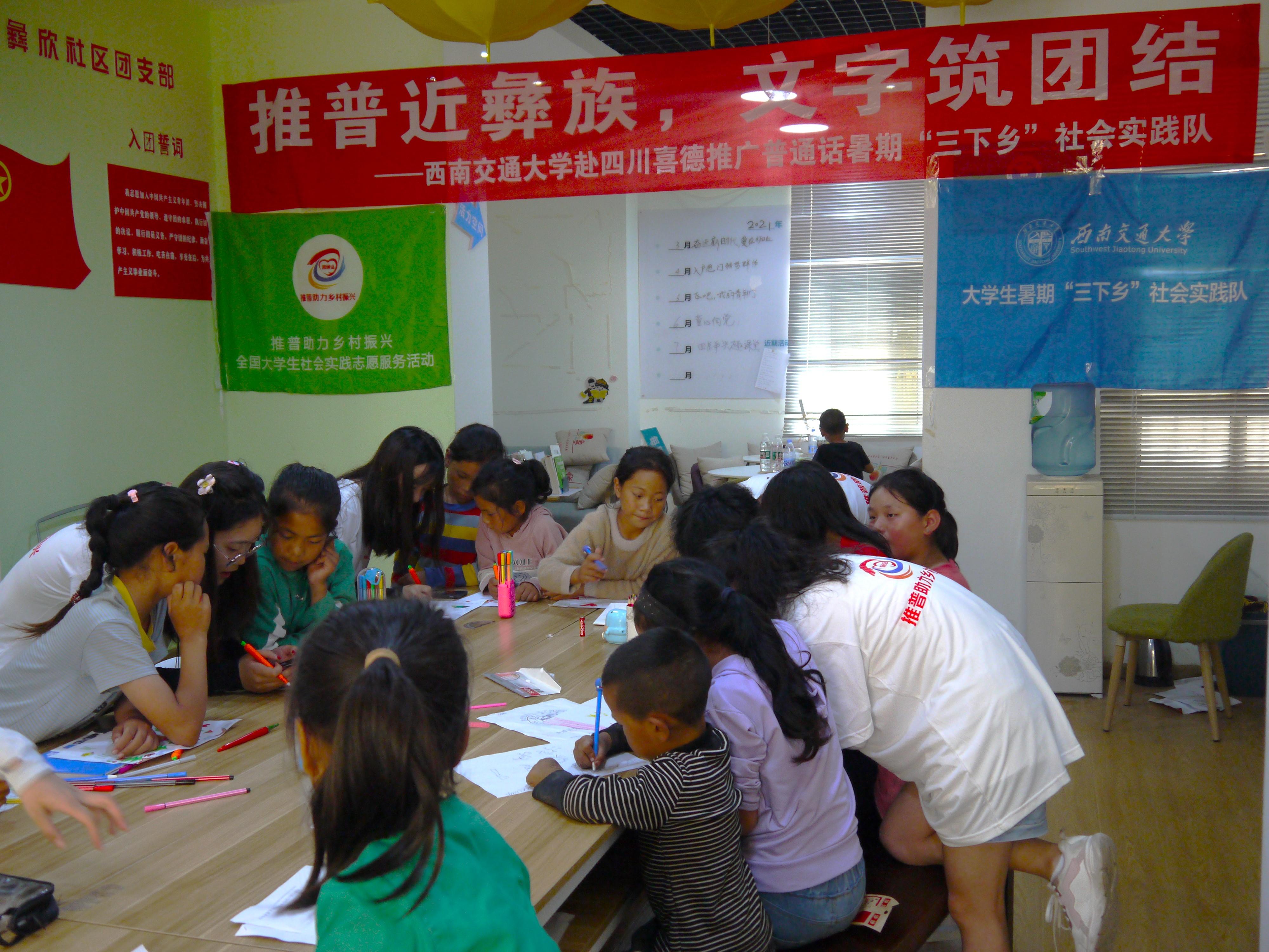 喜德县地处四川省凉山自治州彝族聚居区腹地,彝族人口占90.5%。这里的光明镇彝欣社区是该县最大的易地扶贫搬迁集中安置点,共安置群众1698户,其中易地扶贫搬迁1399户、7084人,是普通话推广的重点地区。实践团队来到彝欣社区通过走访调研、点位宣传、趣味培训、红色课堂等方式开展普通话调研和推广活动,以文化凝聚共识,以共识汇聚力量。
