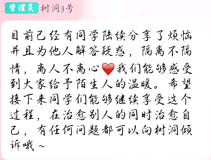 2022年9月26日12点“解忧树洞 从心开始”心理主题活动圆满结束,但防治心理“感冒”仍前路漫漫,“9·25”心理健康节系列活动也将陆续开展。我们希望以此活动为引,鼓励同学们积极向外界倾诉烦恼,在被治愈的同时也向他人传递一份温暖与善意。期待与同学们的下一次相见!