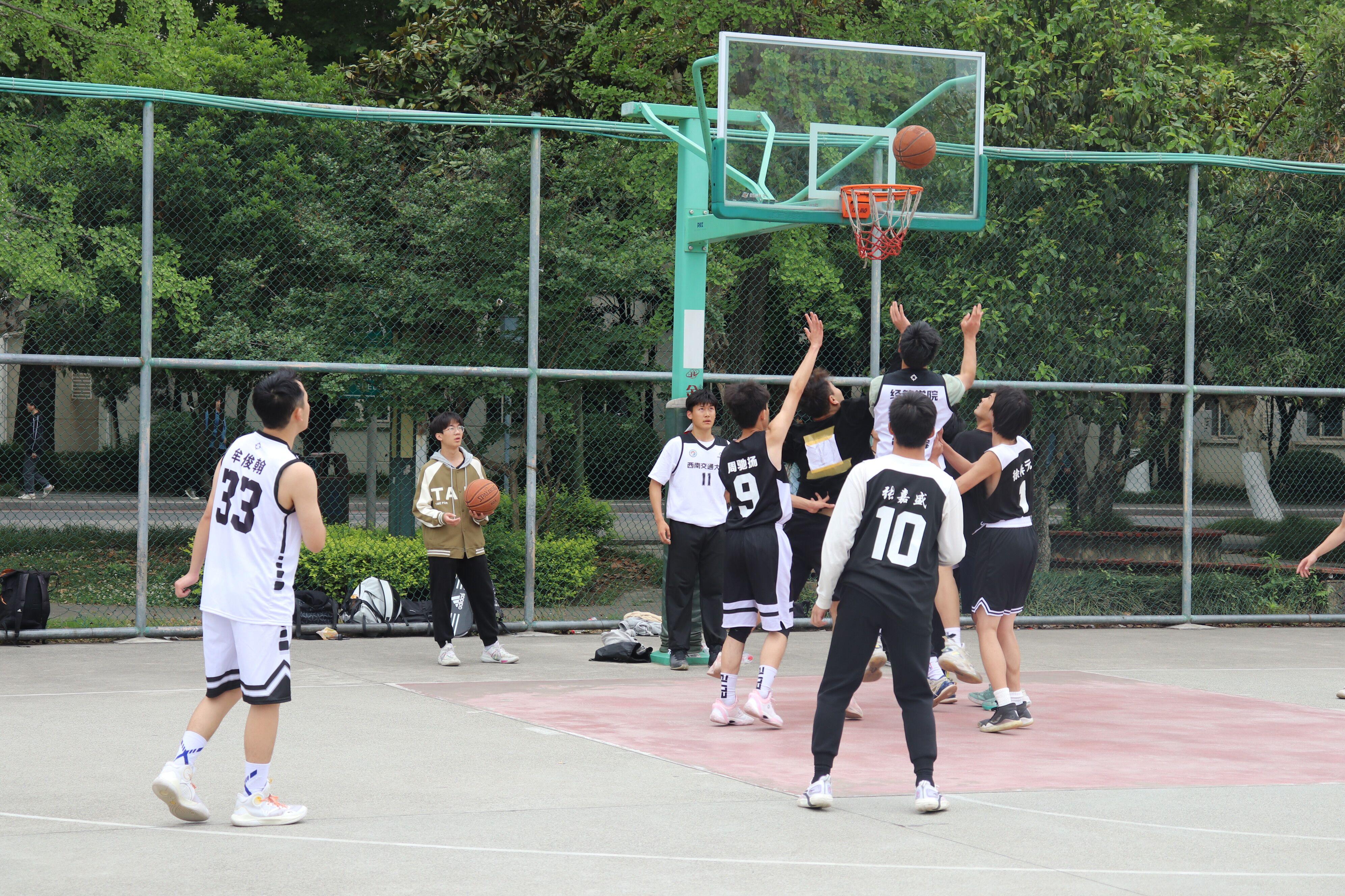 在热烈的掌声中,杨宏毅老师、陈建奇老师为揭幕战的两场比赛开球。哨声响起,激烈的角逐即刻展开。比赛场上气氛紧张而热烈,欢呼声此起彼伏,双方队员你争我夺、穿插跑位,挡拆掩护、突破传球,充分展现了“交子”们敢闯敢拼、开拓进取的青春风采。激战过后,有点is队以56:49战胜镜湖大乌龟队,梅狸猫开Amagi的门队以67:23战胜经管研究生2队,揭幕战圆满落幕。