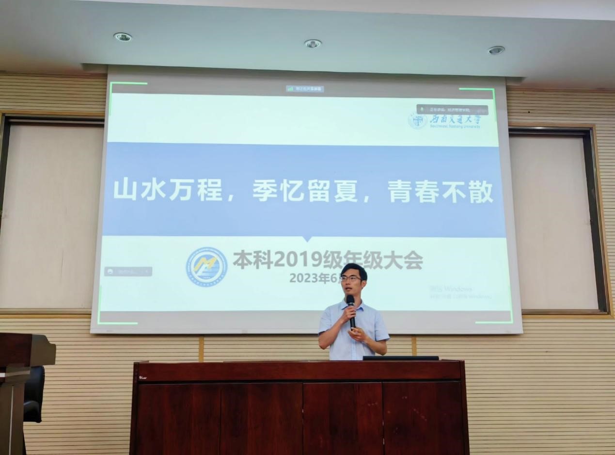 最后,苏扬老师以“山水万程 季忆留夏 青春不散”为主题对本科2019级这四年的学习与工作情况进行了梳理和总结,通报了与同学们相关的重要数据,如四六级考试通过率、升学率、毕业去向情况、升学院校等,提醒同学们在毕业之际也要遵守规章制度,对自己的未来负责,以平和感恩的心态迎接毕业,把美好回忆封存纪念。苏老师指出同学们在毕业之后也应树立终身学习的理念,希望同学们能够牢记党员的身份和使命,牢记交大学子的身份和使命,在未来不同领域发光发热,祝愿同学们美好进入下一段人生篇章和毕业快乐。