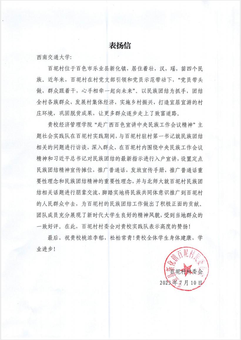 在四天的实践活动中,实践队遇上了同样前来学习调研的社会实践团队,遇上了当地热情淳朴的各民族同胞,遇上了深夜加班为群众解决问题的基层干部。实践结束后,百坭村村委充分认可了本次主题实践活动并向best365网页版登录官方网站发来表扬信。
