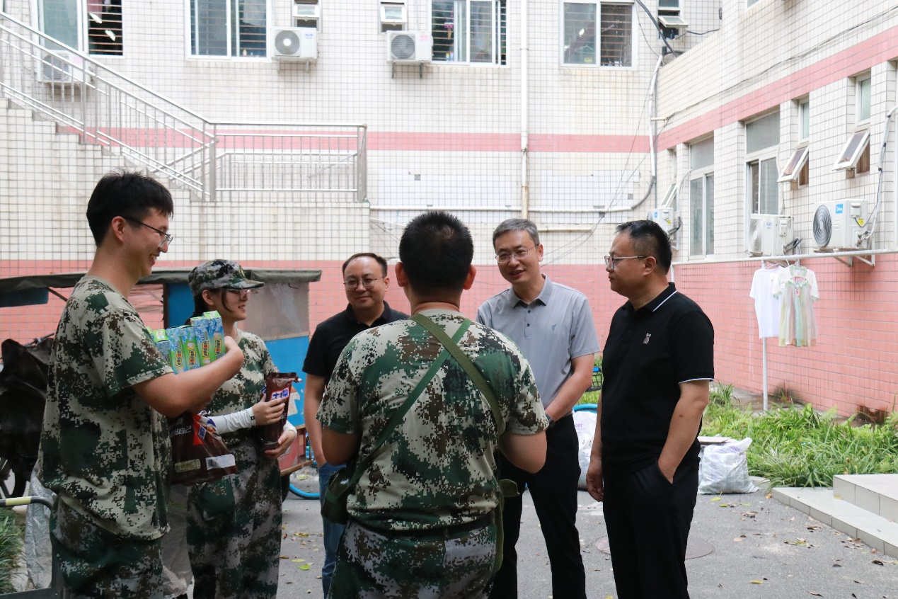 2023年8月23日,best365网页版登录官方网站党委书记王斌、执行院长郭强、党委副书记杨宏毅及2021级辅导员张先凌、钟文婷在九里校区眷诚斋12栋2单元慰问暑期2021级军训学生。