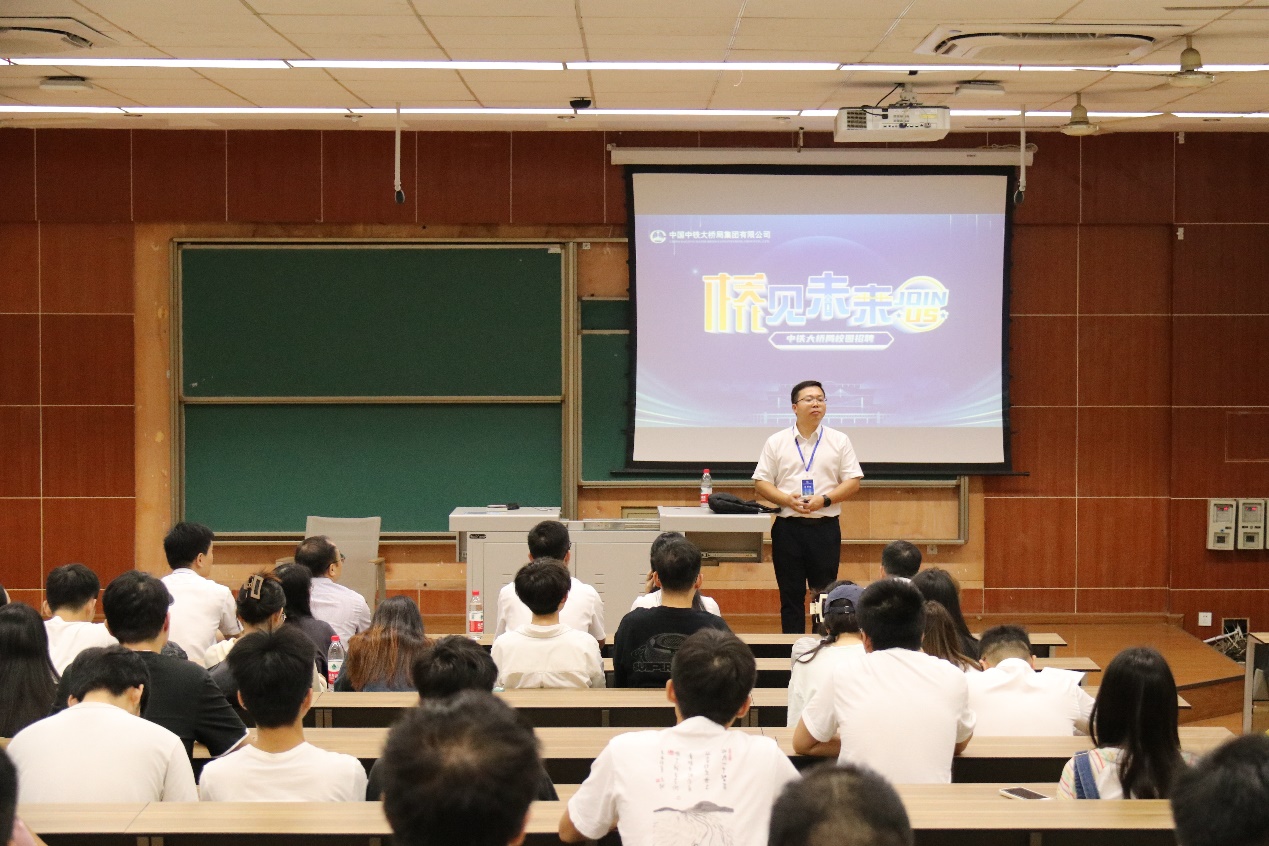 接着,我校优秀校友王阳回忆了自己的个人成长经历。他从三个方面介绍了自己加入中铁大桥局的理由:1.集团能够为大家提供强大的优秀的平台,比如国家重点实验室和超级工程等;2.能够为大家提供良好的成长环境,如完善的培养体系、特色的培养机制和综合实力强劲的合作伙伴;3.加入中铁大桥局会有优秀的师兄师姐做榜样,在成长过程中提供无微不至的关怀和帮助。
