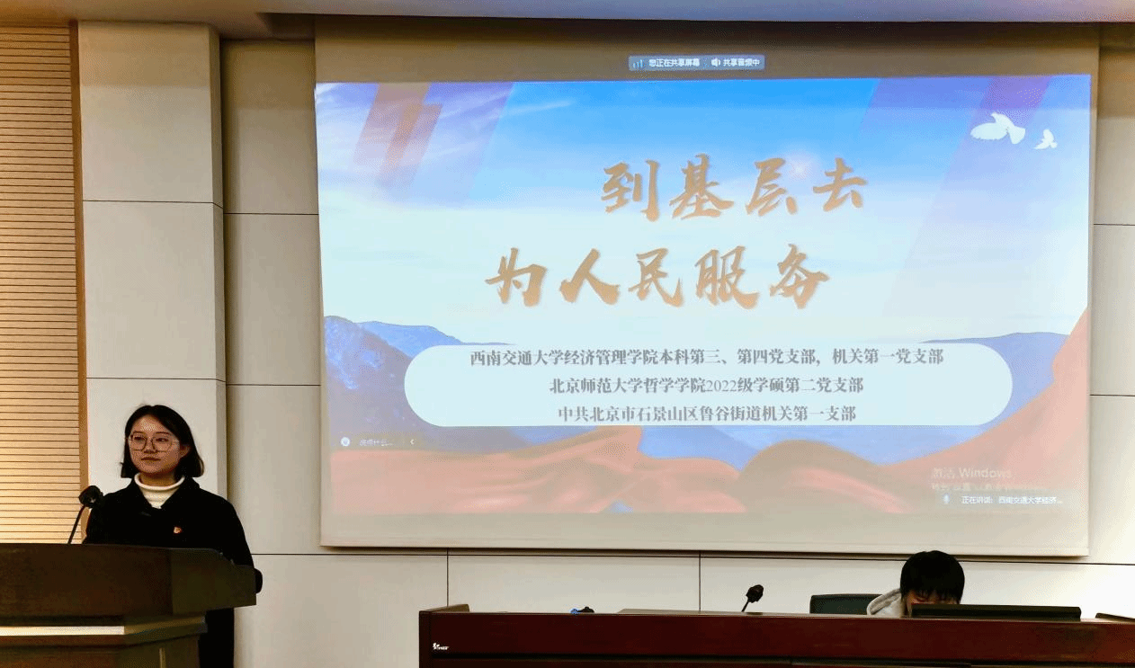 全心全意为人民服务是中国共产党的根本宗旨,而深入基层则是实现为人民服务的重要途径。为提高支部成员思想认识,明确基层工作的重要意义,鼓励支部青年积极投身于中国式现代化建设、以蓬勃风貌建功新时代,2023年11月16日下午,best365网页版登录官方网站本科第三、第四党支部、机关第一党支部、北京师范大学哲学学院2022级学硕第二党支部、北京市石景山区鲁谷街道机关第一党支部以线上线下相结合的方式开展“到基层去,为人民服务”主题党日活动,本科第三党支部书记苏扬,本科第四党支部书记张先凌,机关第一党支部书记何鹏,以及各支部部分成员于J0215线下参会。