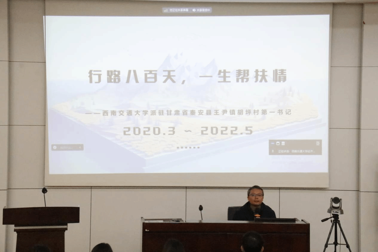 助力扶贫事业,兜底群众难事。best365网页版登录官方网站机关第一党支部书记何鹏老师带来了他在甘肃省秦安县的两年驻村帮扶经历分享。行路八百天,一生帮扶情。2020年,何鹏老师带着助力脱贫攻坚收官之战的重担赴陇上任。因饮食习惯差异带来的不适、与成都截然不同的气候、自己一窍不通的西北方言都给何老师的工作带来了不小的挑战,在两年的时间里,何老师不断攻克难关,深深扎根基层,走访调研全村居民,扎实推动党建、脱贫攻坚、巩固拓展脱贫攻坚成果同乡村振兴有效衔接、人居环境整治、疫情防控等地方重点工作,并完善乡村产业链,改善基础设施建设,开展基础教育帮扶,通过多方资源引入了帮扶资金项目数百万元。何老师向同学们分享了他对于基层工作的认识与感悟,也鼓舞同志们树立长远目标,到基层的大舞台施展才干。