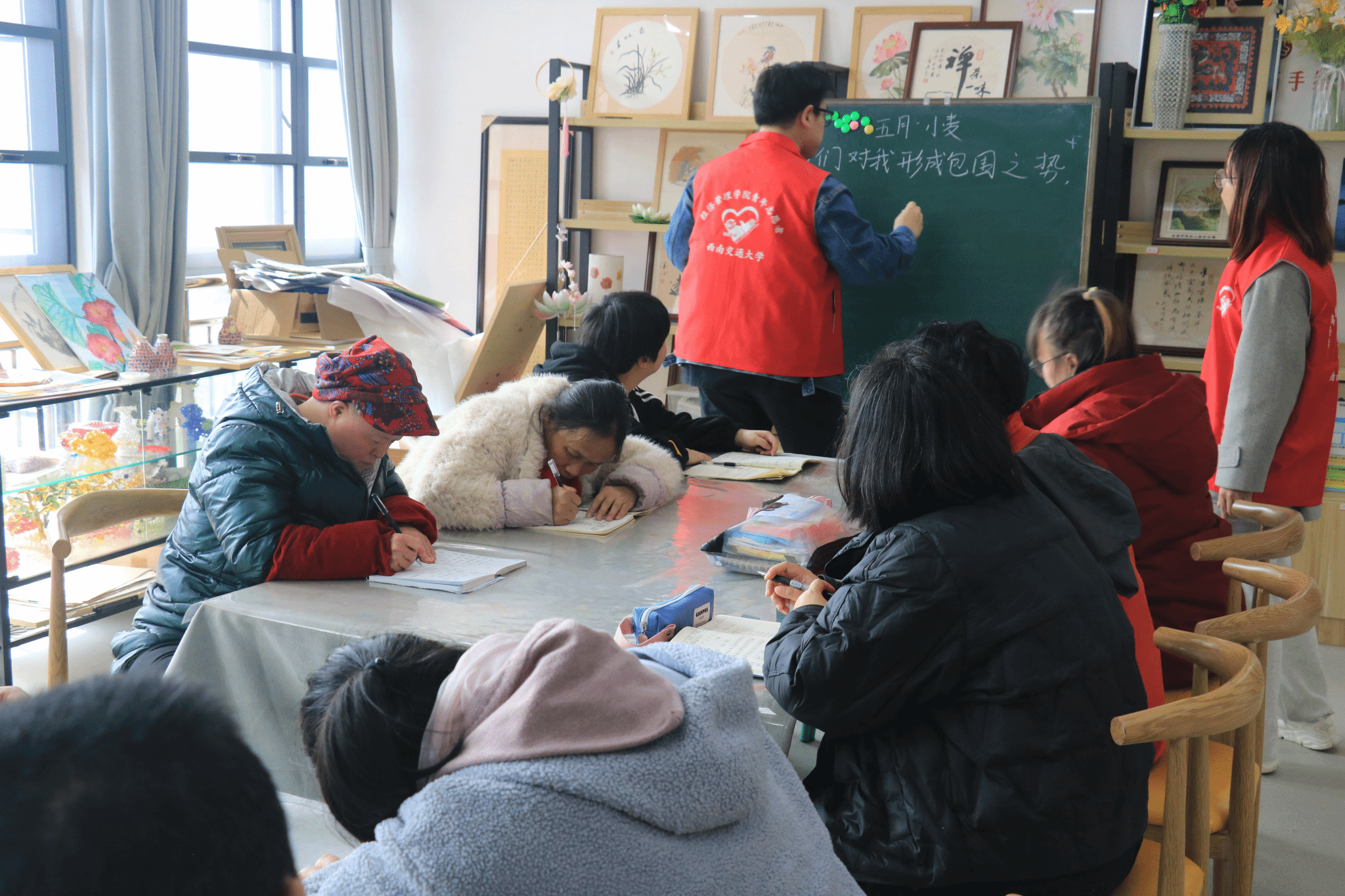 2025年3月,经管学院青年志愿者协会分别走进善工家园与阳光家园,为残障群体送去温暖与关怀。3月6日下午,青协组织志愿者前往善工家园,举办了“助残之旅,花与暖的交织之旅”主题手工花制作活动。活动中,志愿者与残障人士结成“一对一”帮扶小组,耐心细致地示范皱纹纸折叠、丝网花瓣缠绕等手工技巧。面对听障学员,志愿者们通过形象的手势和纸笔书写进行沟通交流;对于肢体障碍者,志愿者则贴心协助完成剪裁、粘贴等操作。经过两个小时的共同努力,一朵朵娇艳的郁金香、玫瑰、百合等手工花绚丽绽放。此次活动,不仅让残障人士深切感受到了社会的关爱与尊重,也让志愿者们收获了“被需要”的幸福感,进一步增强了社会责任感。