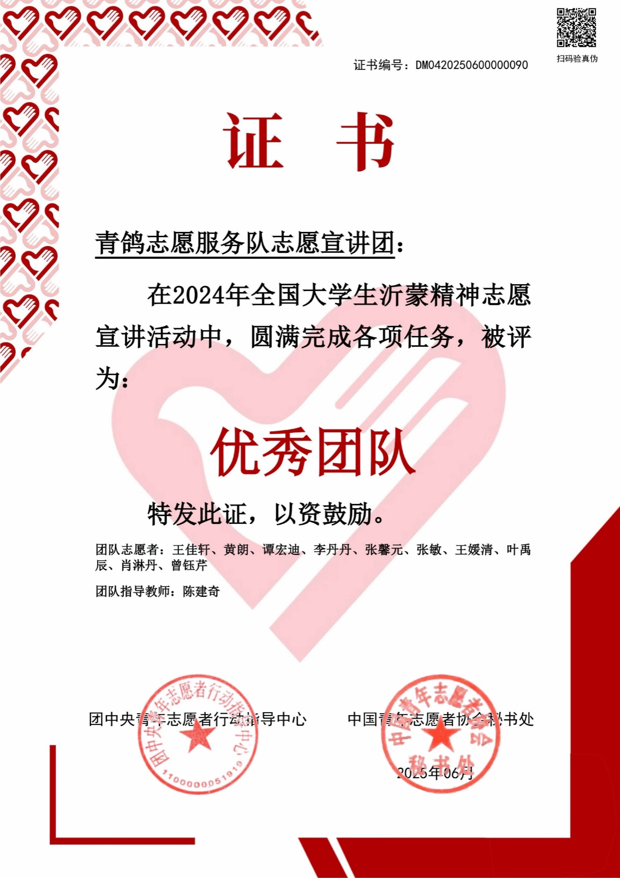 近日,在团中央青年志愿者行动指导中心、共青团山东省委和中共临沂市委联合举办的2024年全国大学生沂蒙精神志愿宣讲活动中,best365网页版登录官方网站青鸽志愿服务队沂蒙精神志愿宣讲团圆满完成各项任务,被评为优秀团队。