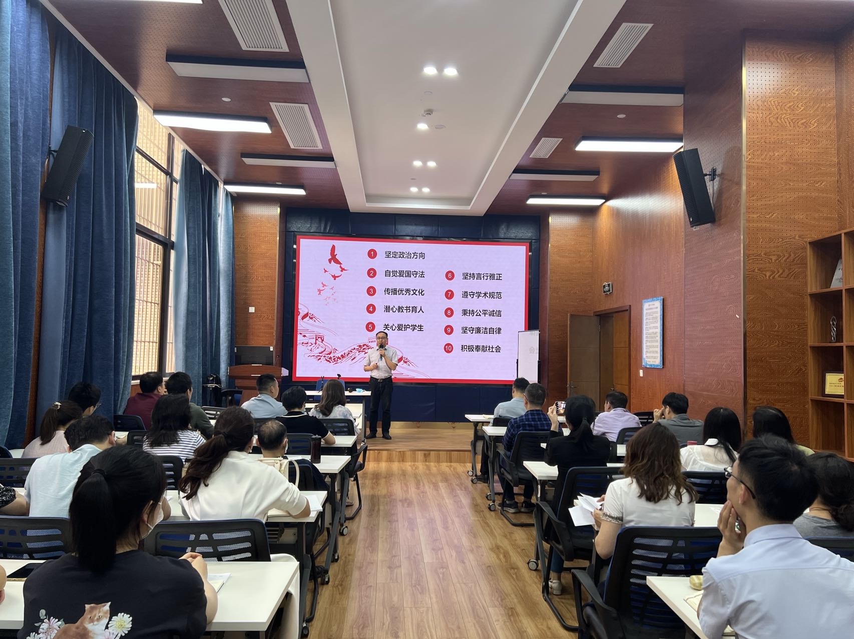 学院党委副书记杨宏毅带领大家逐条学习了《新时代高校教师职业行为十项准则》的内涵,并对应讲述了相关的警示案例。杨宏毅谈到,学院教职工要进一步加强学习党的方针政策,提高政治素养,遵守高校教师职业行为规范,言行得体,时刻以《新时代高校教师职业行为十项准则》严格要求自己。