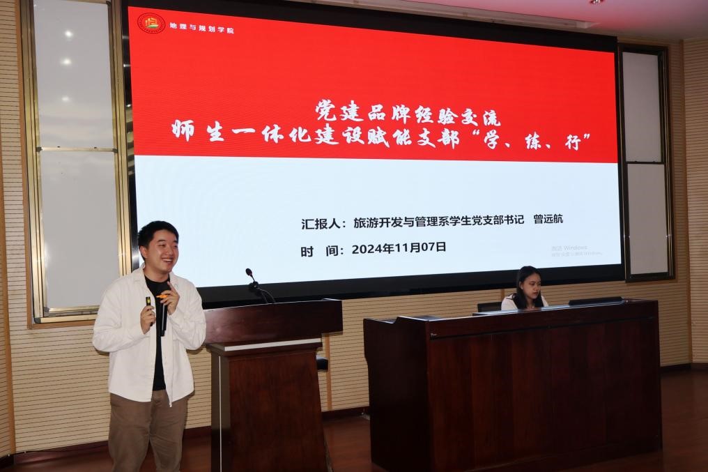 接下来,成都理工大学地理与规划学院旅游开发与管理系学生党支部书记曾远航老师进行了支部工作经验分享。结合旅游管理专业特色,曾远航老师提到通过红色旅游实践、专业竞赛和“三下乡”活动,将党建与专业相结合,增强党员文化自信和责任担当,以服务乡村振兴,传承红色精神。