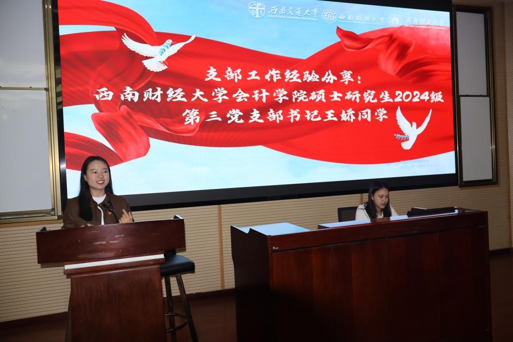 最后,由西南财经大学会计学院硕士研究生2024级第三党支部书记王娇同志带来支部工作经验分享。作为成立不到两个月的新支部,她通过明确分工、规范管理、创新活动推动支部建设,积极开展校史学习和行业交流,增强党员责任感与服务社会的意识,为后续工作打下了坚实基础。