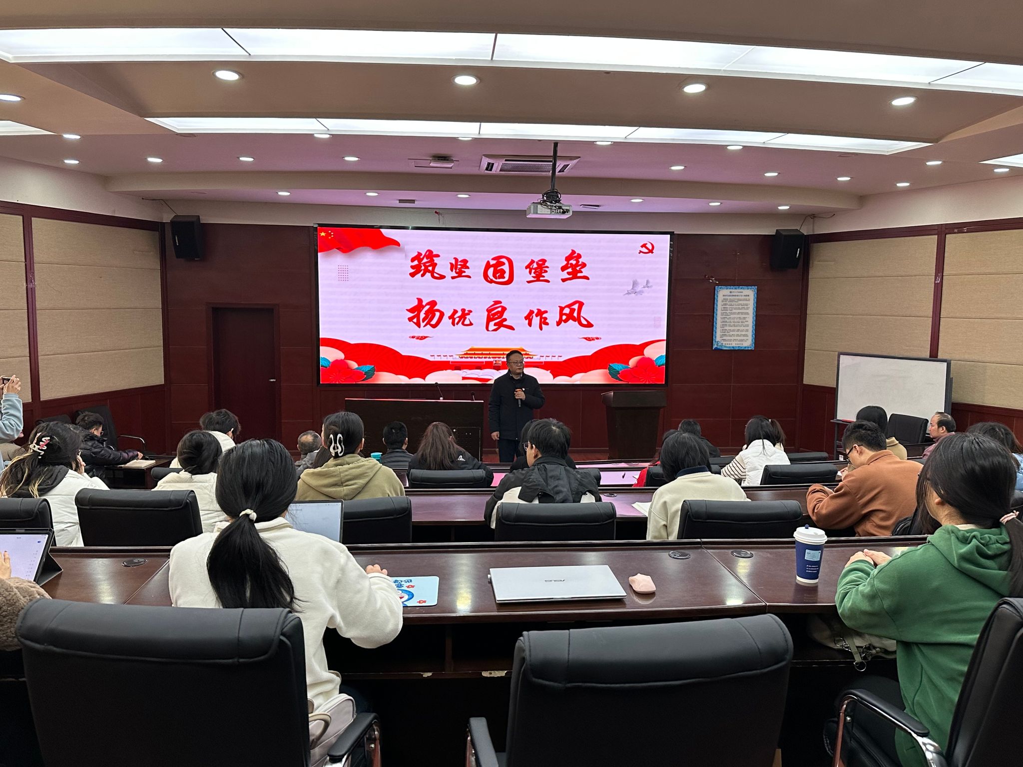 2024年11月28日上午10点半,best365网页版登录官方网站党委在零号楼J0228教室开展党委书记讲党课活动,本次专题党课由学院党委书记郭强主讲,学院党委副书记晏理斌、师生党支部委员和党员代表近40人参加了本次党课。
