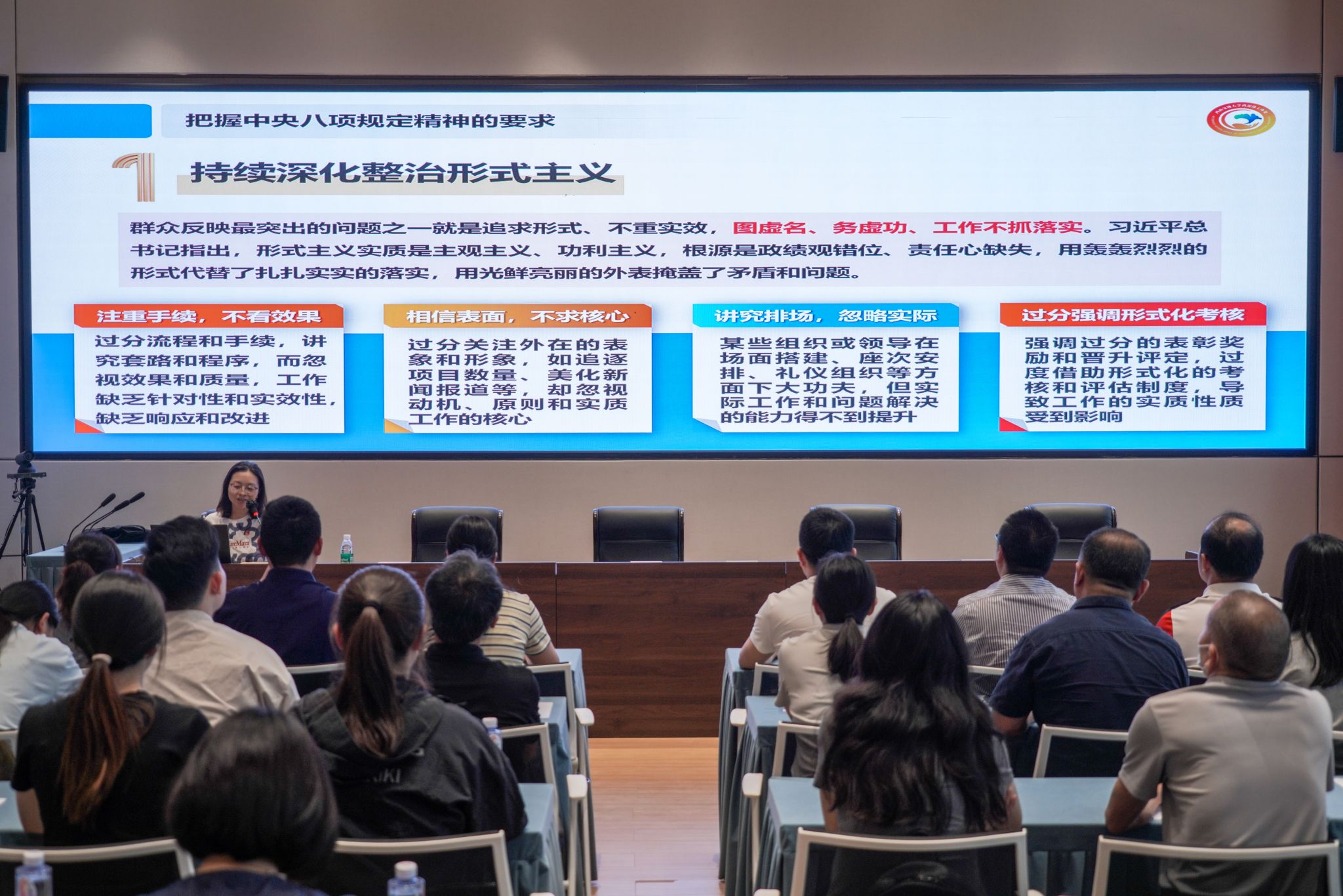 蒋佳书记围绕深入贯彻中央八项规定精神学习教育的意义、要求,结合实际案例,深入浅出地为大家上了一堂生动的课程。她强调,中央八项规定是全面从严治党的重要抓手,全体党员干部要深刻认识其长期性、复杂性和艰巨性,将中央八项规定精神融入日常工作和生活中,不断增强纪律意识和规矩意识,始终做到心有所畏、言有所戒、行有所止。与会人员纷纷表示,要将学习热情和学习成效转化为干事创业的动力,结合自身工作,以党建为引领,加强作风建设,推动学院中心工作提质增效。