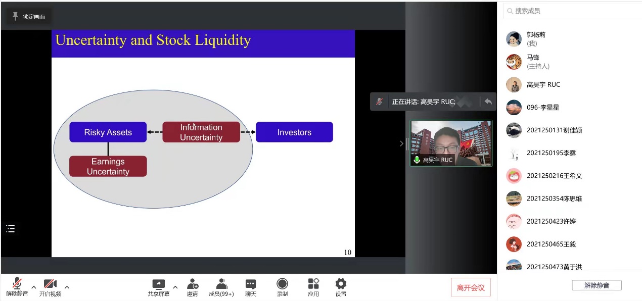 2022年3月10日上午10点,中国人民大学财政金融学院高昊宇副教授的学术讲座在线上举行。高昊宇副教授以“Does Uncertainty Matter in Stock Liquidity? Evidence from the COVID-19 Pandemic”为主题进行了精彩的分享。本次学术活动由best365网页版登录官方网站马锋副教授主持,朱宏泉教授、梁超老师以及学院部分研究生在线参加了本次讲座。