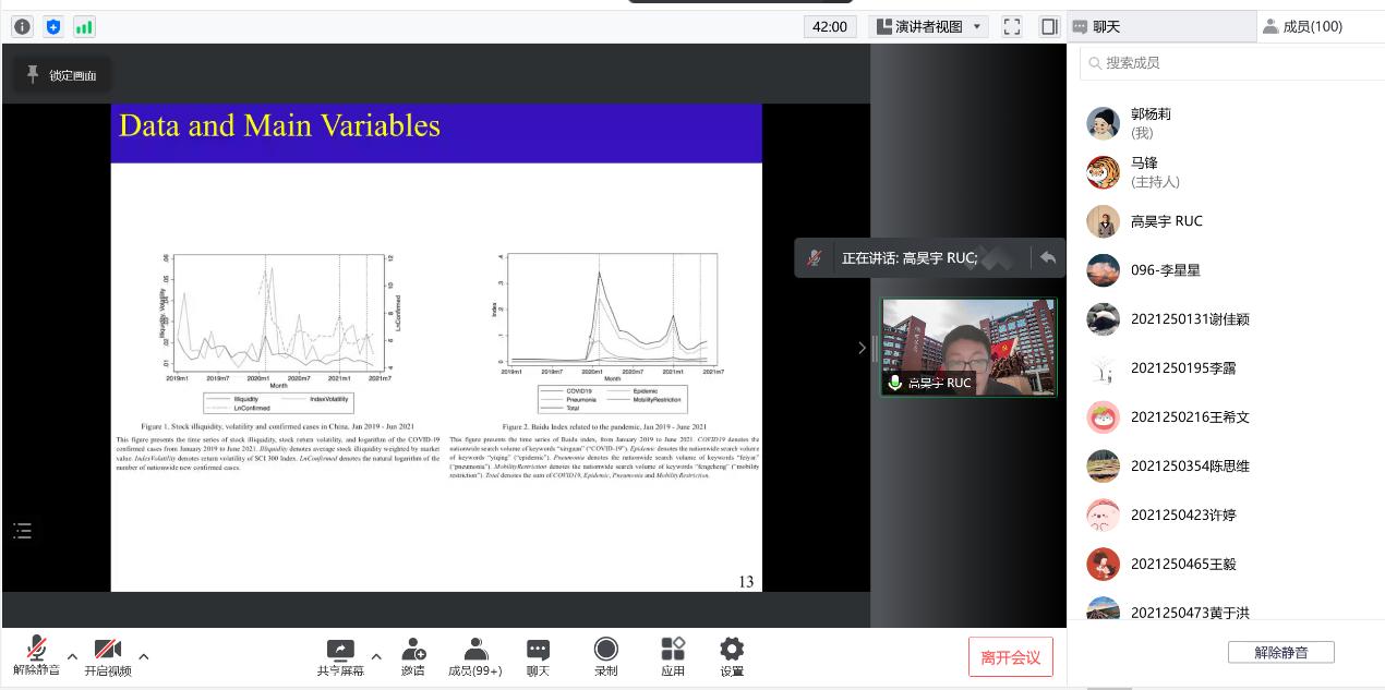 随后,高昊宇副教授对相关文献进行了梳理,从理论角度提出了流动性的两种影响机制。高昊宇介绍了实证部分的研究思路。通过实证研究发现,疫情所带来的相当大的不确定性造成了股票流动性的显著枯竭。同时也证明了之前关于不确定性影响股票流动性的两种理论假设。此外,通过一系列稳健性检验,排除了公司受到其他因素的影响(如其他不确定性事件,交易限制,市场情绪,风险厌恶),证明了新冠疫情带来的不确定性会造成公司股票流动性下降。