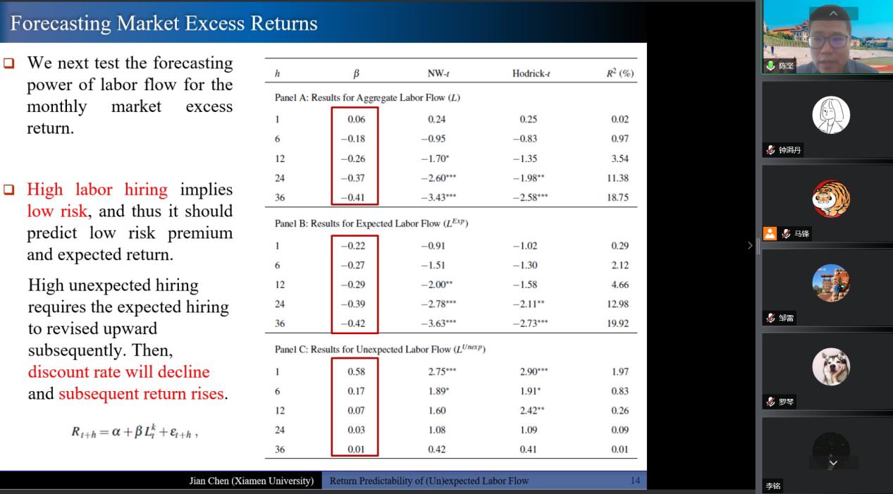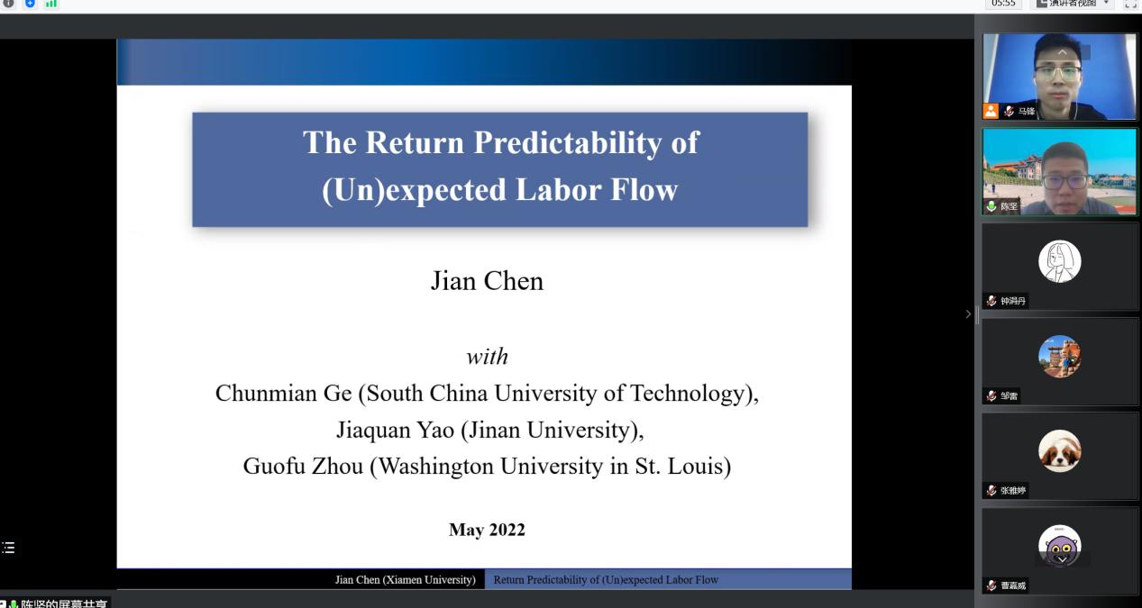 2022年5月17日上午10点,厦门大学经济学院陈坚教授的学术讲座在线上举行。陈坚教授以“The Return Predictability of (Un)expected Labor Flow”为主题进行了精彩的分享。本次学术活动由best365网页版登录官方网站马锋副教授主持,学院部分博士生和研究生在线参加了本次讲座。