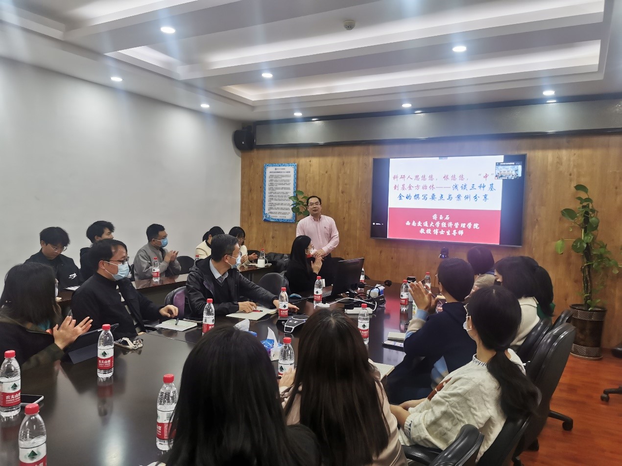 2022年11月24日下午3点,学院在九里校区信息楼0607召开2023年基金申报交流会(第二场)。受疫情影响,此次会议采取线上线下相结合的方式,全院40余位教师和博士生参加会议。会议由best365网页版登录官方网站党委书记王斌主持,best365官网市场学系蒋玉石教授分享了申报教育部人文社科基金、国家社会科学基金和国家自然科学基金项目的经验。