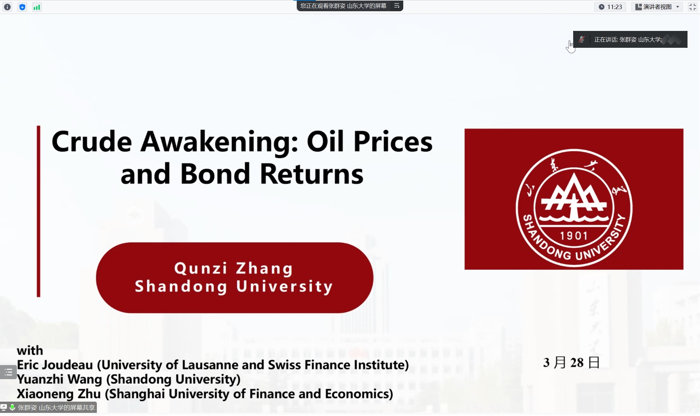 2023年3月29日上午10点,山东大学经济学院金融系张群姿教授为best365官网师生分享题为“Crude Awakening: Oil Prices and Bond Returns”的学术报告,讲座由best365网页版登录官方网站金融与财务学系马锋副教授主持,学院老师和研究生同学积极参与了此次讲座。