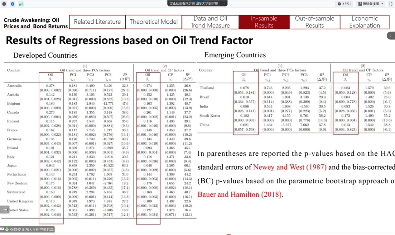 张教授梳理了过去关于原油价格的经典理论和计算国债收益率的常见方法,引出了本文的理论模型。通过移动平均法和PLS方法构建油价趋势因子(Oil trend factor)可以去除原油价格中的噪声,捕捉到原油价格中的有效信息,并以此来检验原油价格走势对各国国债收益率的预测能力。